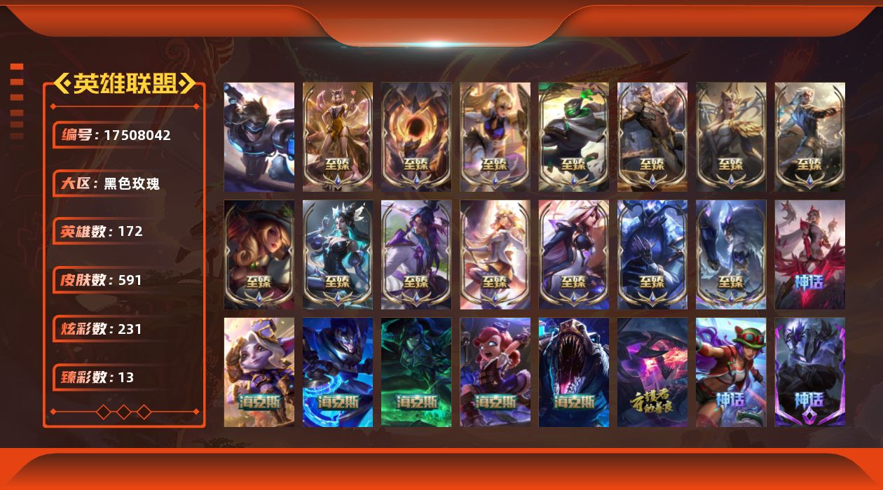 [17508042]钻石段位-172英雄-591皮肤-231炫彩-1终极-26神话-92限定-57传说-97史诗