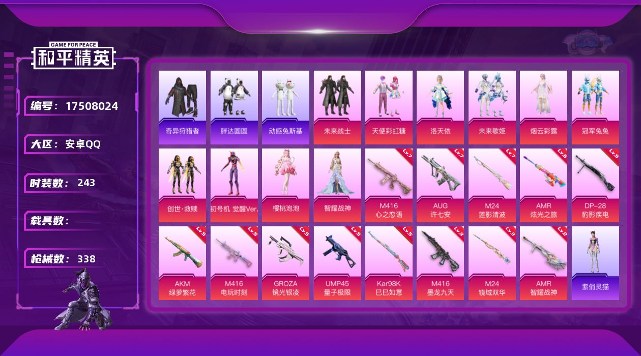 安卓 手Q-10粉装-16特效枪-0载具-7粉色飞行器-103585热力值-21王牌印记-243套装-338枪皮