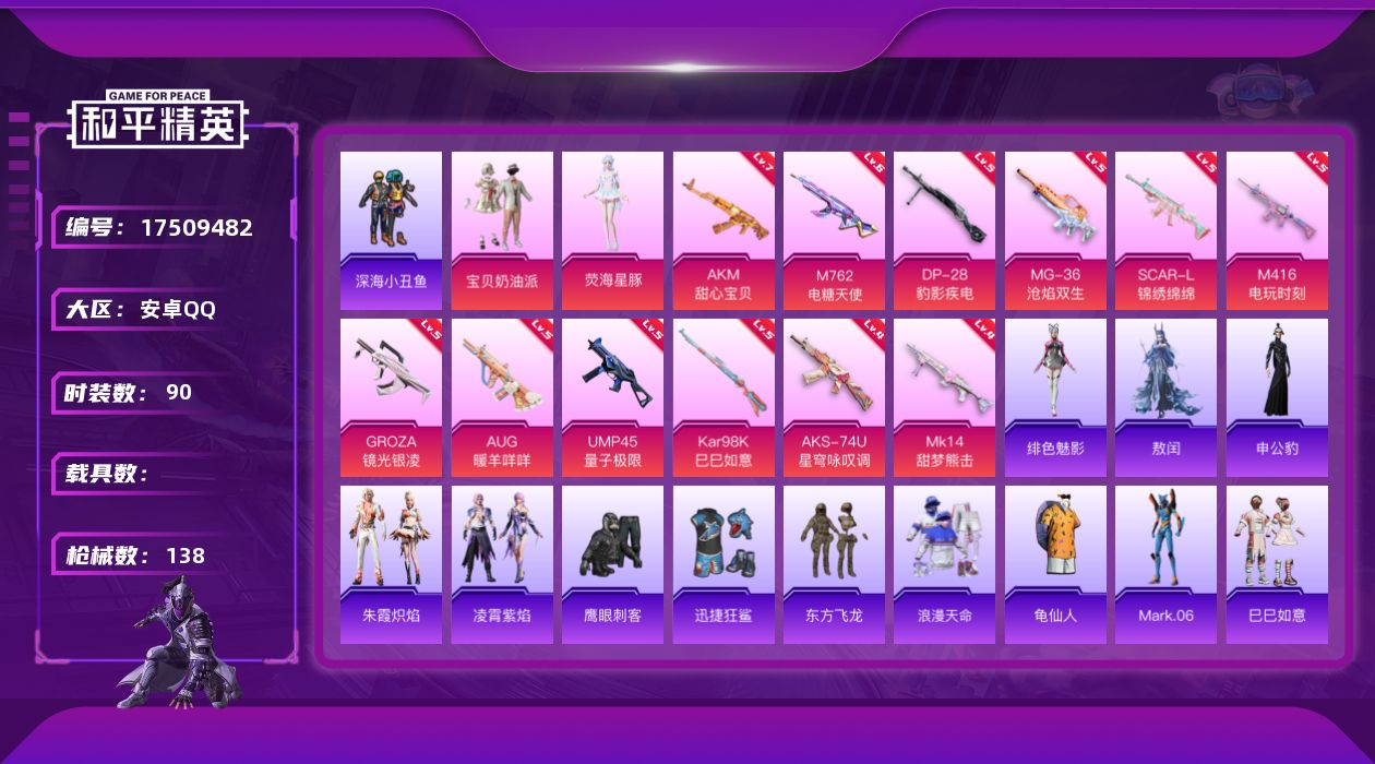 [17509482]安卓 手Q-2粉装-12特效枪-0载具-2粉色飞行器-41995热力值-5王牌印记-90套装-138枪皮 【热门品类】:套装-浪漫天命,套装-深海小丑鱼,套装-龟仙人,角色-Mark.06 【粉色套装】:粉装-宝贝奶油派,角色-荧海星豚 【粉色枪皮等级】:AKM-甜心宝贝(七级),SCAR-L-锦绣绵绵(五级),M416-电玩时刻(五级),GROZA-镜光银凌(五级),AUG-暖羊咩咩(五级),M762-电糖天使(六级),UMP45-量子极限(五级),AKS-74U-星穹咏叹调(四级),Kar98K-巳巳如意(五级),Mk14-甜梦熊击(四级),DP-28-豹影疾电(五级),MG-36-沧焰双生(五级) 【粉色枪皮】:AKM-甜心宝贝,SCAR-L-锦绣绵绵,M416-电玩时刻,GROZA-镜光银凌,AUG-暖羊咩咩,M762-电糖天使,UMP45-量子极限,AKS-74U-星穹咏叹调,Kar98K-巳巳如意,Mk14-甜梦熊击,DP-28-豹影疾电,MG-36-沧焰双生 【粉色飞行器】:炫彩糖果飞行器,灵珠游龙飞行器 【粉色降落伞】:甜心宝贝降落伞,精灵梦叶罗丽降落伞,忍者神龟降落伞,千金淑猫降落伞,临安公主降落伞,魔童闹海 敖丙降落伞,异瞳寒姬降落伞,炫彩糖果降落伞 【稀有套装】:套装-龟仙人,套装-巳巳如意,套装-雪国风尚,套装-炫彩糖果,套装-雏菊兔兔,套装-萝兰蝴蝶,套装-小熊娃娃,角色-米开朗基罗,套装-青团波波,角色-都市丽猫,套装-燕燕于飞,套装-鱼渊荷华,套装-朱霞炽焰,套装-凌霄紫焰,角色-敖闰,角色-申公豹,角色-绯色魅影,套装-雨过天青,套装-红釉青花 【稀有枪皮】:AKM-星之彼岸,SCAR-L-玉兔迎春,M416-糯团青竹,GROZA-影袭,GROZA-恐龙拽拽,QBZ-彩虹符号,M762-甜心宝贝,AC-VAL-天降萌叽,AC-VAL-快闪甜心,蜜獾-天降萌叽,ARX-凌霄紫焰,UZI-啾咪啾咪,UZI-天降萌叽,UZI-影袭,Vector-焰鹰斗篷,汤姆逊-天降萌叽,JS9-凌霄紫焰,P90-快闪甜心,P90-巳巳如意,Kar98K-影袭,M24-影袭,M24-樱桃泡泡,AWM-焰鹰斗篷,AWM-黄金龙骨,SKS-炫彩节奏,SKS-糯团青竹,MK20-H-快闪甜心,S686-彩虹符号,S686-生命誓言,S686-巳巳如意,S12K