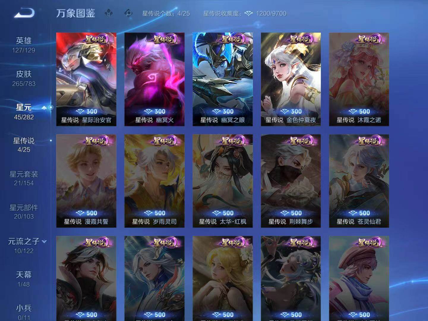 白起狰,芈月重明,典韦穷奇,狂铁御狮,米莱狄御霄,牛魔御旌,盾山御銮,夏侯惇朔风刀,明世隐疑决卦,老夫子醍醐杖,鬼谷子原初探秘者,狄仁杰万华元夜,程咬金演武夺筹,钟馗驱傩正仪,苏烈千军破阵,吕布猎兽之王,嬴政白昼王子,女娲朔望之晖,典韦蓝屏警告,钟馗神迹守卫,鲁班七号狮舞东方,沈梦溪星空之诺,李元芳银河之约,刘邦夺宝奇兵,马可波罗暗影游猎,蒙犽狂想玩偶喵,元歌云间偶戏,弈星混沌棋,达摩沙漠行僧,兰陵王金庭之子,沈梦溪大漠名商,李元芳云中旅人,桑启海盐诗旅,裴擒虎擒涛扼浪,鲁班大师探海日志,张良古海寻踪