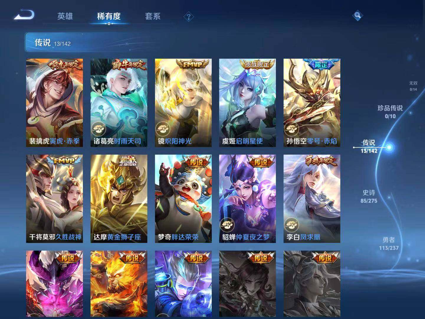 【传说皮肤】:裴擒虎寅虎赤拳,诸葛亮时雨天司,镜炽阳神光,虞姬启明星使,孙悟空零号赤焰,干将莫邪久胜战神,达摩黄金狮子座,梦奇胖达荣荣,貂蝉仲夏夜之梦,李白凤求凰,宫本武藏地狱之眼,孙悟空地狱火,狄仁杰超时空战士