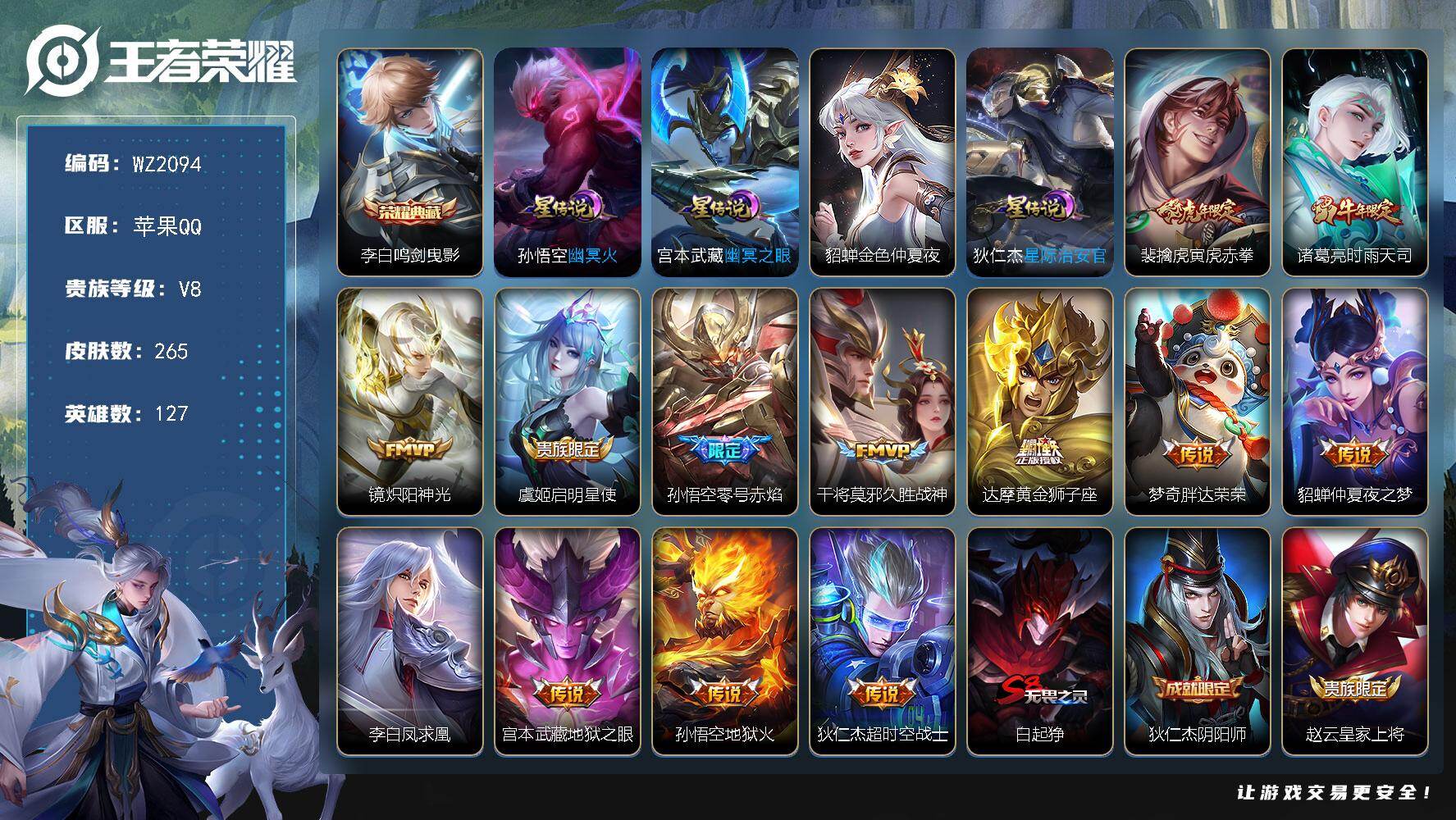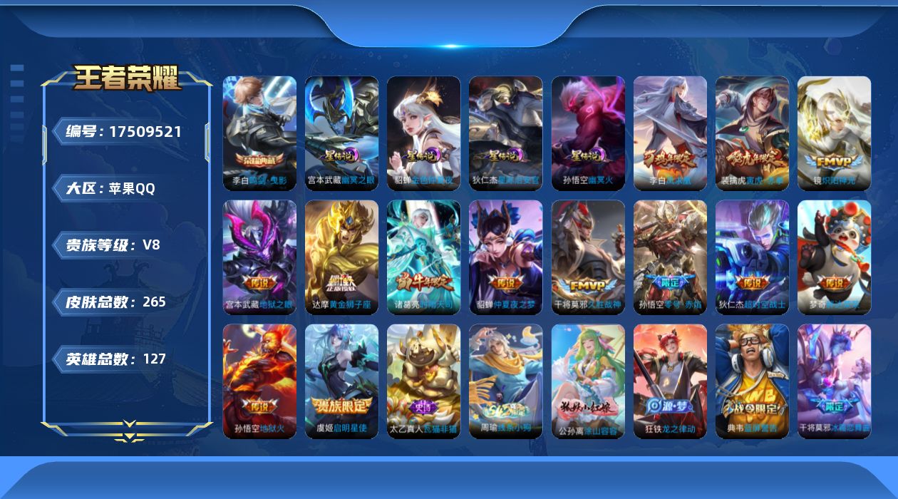 - [11864115]V8 9传说 123英雄 289皮肤 可修改实名 优质装备:猫影幻舞,炽阳神光,一念神魔,胖达荣荣,乞巧织情,淬星耀世,追逃游戏(亚瑟),涂山容容 珍宝阁皮:玩趣恶龙 限定皮:鸣野蒿,至尊宝,高山流水,五谷丰年,青龙志(铠年限),游园惊梦,梁祝,玄武志(苏烈年限),默契交锋-花木兰,美猴王,时之祈愿-云中君,匿光启智者 史诗皮:谪仙醉月,石田雨龙,撼地雄心,破空之剑,琥珀纪元伽罗,蔬乡物语(鲁班七号),紫霞仙子,黄金分割率,特工魅影,江河有灵,百解令(蒙犽),高渐离燃音魔法,匿光破解者,冰冠公主,晚萤,电玩·爆裂旋风,末日机甲-吕布,猫狗日记-孙策,猫狗日记-大乔,节奏热浪,修罗,女仆咖啡,摇滚巨星,水果甜心,天才门将,星夜王子,心灵骇客,功夫厨神,德古拉伯爵,暗隐猎兽者,鬼剑武藏,心灵战警,舞动绿茵,地狱岩魂,诗语江南,纤云弄巧,拒霜思,缤纷独角兽,乘风破浪,逐浪之夏,水晶猎龙者,曙光守护者,箭羽风息,金属风暴,圣诞狂欢,圣诞恋歌,暗夜贵公子,魅力维加斯,未来纪元-赵云