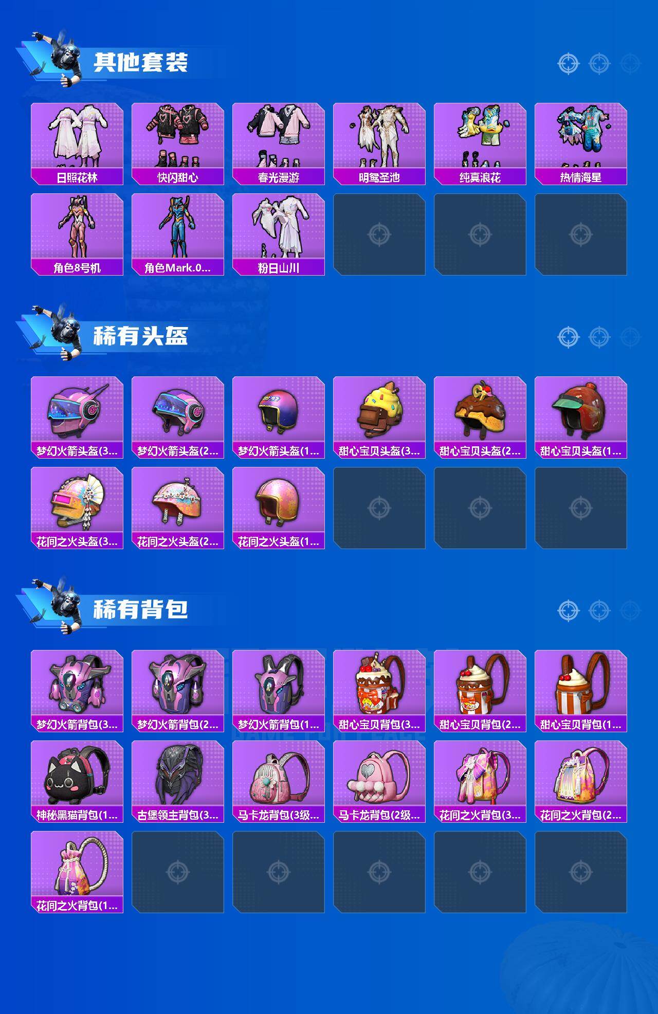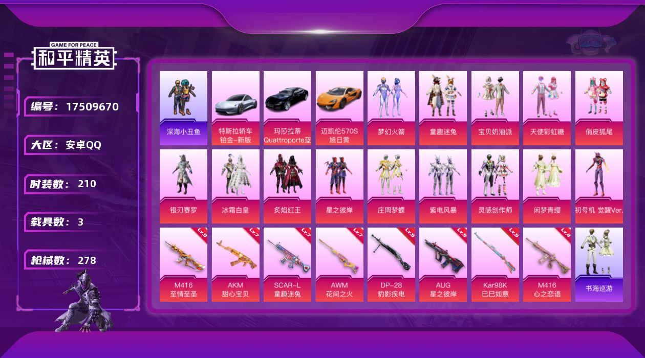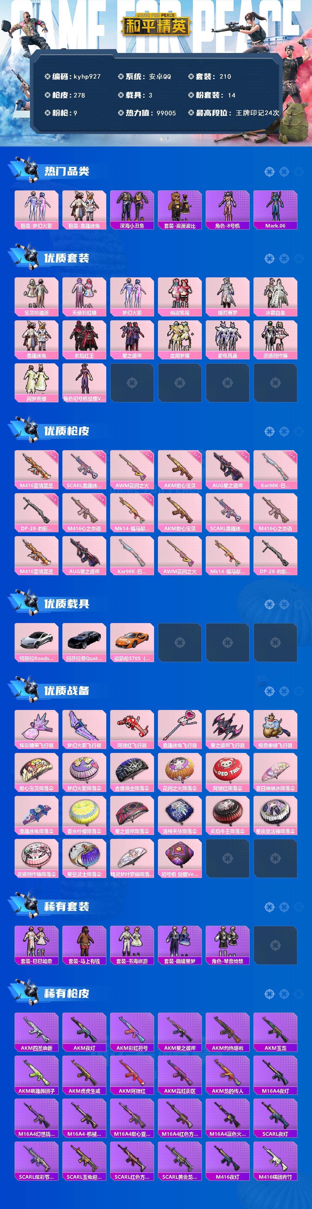 [17509670]安卓 手Q-14粉装-9特效枪-3载具-6粉色飞行器-99005热力值-24王牌印记-210套装-278枪皮 【热门品类】:粉装-梦幻火箭,粉装-童趣迷兔,套装-深海小丑鱼,套装-浪漫波比,角色-8号机,角色-Mark.06 【粉色套装】:粉装-宝贝奶油派,粉装-天使彩虹糖,粉装-梦幻火箭,粉装-俏皮狐尾,粉装-银刃赛罗,粉装-冰霜白皇,粉装-童趣迷兔,粉装-炙焰红王,粉装-星之彼岸,粉装-庄周梦蝶,粉装-紫电风暴,粉装-灵感创作师,粉装-闲梦青缨,角色-初号机 觉醒Ver. 【粉色枪皮等级】:AKM-甜心宝贝(七级),SCAR-L-童趣迷兔(七级),M416-心之恋语(四级),M416-至情至圣(九级),AUG-星之彼岸(五级),Kar98K-巳巳如意(五级),AWM-花间之火(七级),Mk14-福马献瑞(四级),DP-28-豹影疾电(五级) 【粉色载具】:特斯拉Roadster(尊享铂),玛莎拉蒂Quattroporte(夜幕蓝),迈凯伦570S(旭日黄) 【粉色枪皮】:AKM-甜心宝贝,SCAR-L-童趣迷兔,M416-心之恋语,M416-至情至圣,AUG-星之彼岸,Kar98K-巳巳如意,AWM-花间之火,Mk14-福马献瑞,DP-28-豹影疾电 【粉色飞行器】:炫彩糖果飞行器,梦幻火箭飞行器,阿狸红飞行器,童趣迷兔飞行器,星之彼岸飞行器,极意拳锋飞行器 【粉色降落伞】:甜心宝贝降落伞,梦幻火箭降落伞,古堡领主降落伞,花间之火降落伞,阿狸红降落伞,夏日绵绵冰降落伞,童趣迷兔降落伞,香水柠檬降落伞,星之彼岸降落伞,洛神天依降落伞,炙焰牛王降落伞,星夜魔法师降落伞,灵感创作师降落伞,星空武士降落伞,精灵梦叶罗丽降落伞,初号机 觉醒Ver.降落伞 【稀有套装】:套装-巳巳如意,套装-雪国风尚,套装-马上有钱,套装-书海巡游,套装-画境星梦,套装-琴音绮想 【稀有枪皮】:AKM-四圣焕新,AKM-夜灯,AKM-彩虹符号,AKM-星之彼岸,AKM-灼热熔岩,AKM-玉龙,AKM-萌趣颜团子,AKM-虎虎生威,AKM-阿狸红,AKM-霓虹街区,AKM-龙的传人,M16A4-夜灯,M16A4-幻世战舞者,M16A4-机械英豪,M16A4-甜心亚梦,M16A4-红色方程式,M16A4-蓝色火焰,SCAR-L-夜灯,SCAR-L-炫彩节奏,SCAR-L-玉兔迎春,SCAR-