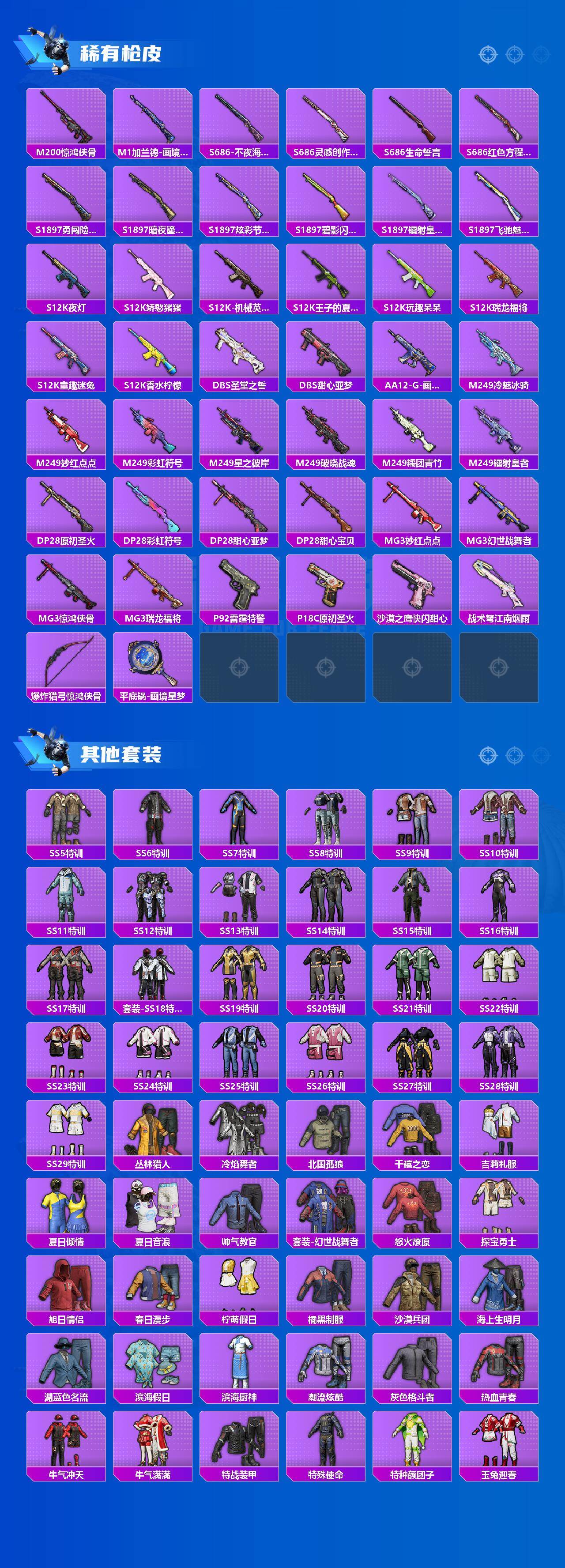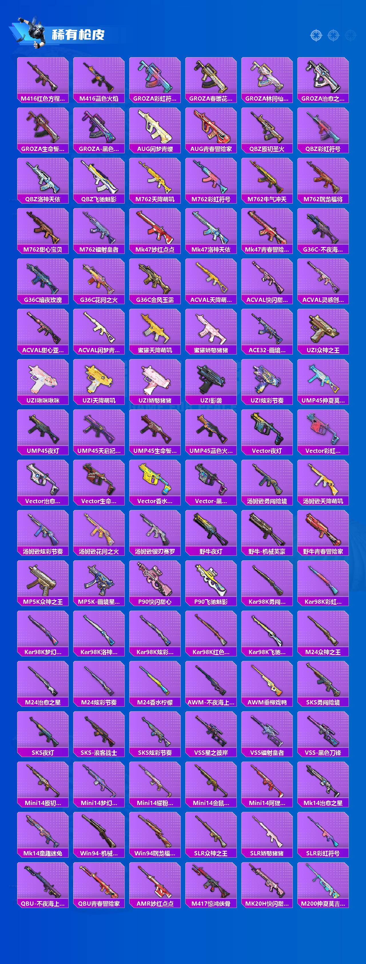 【稀有枪皮】:AKM-四圣焕新,AKM-夜灯,AKM-彩虹符号,AKM-星之彼岸,AKM-灼热熔岩,AKM-玉龙,AKM-萌趣颜团子,AKM-虎虎生威,AKM-阿狸红,AKM-霓虹街区,AKM-龙的传人,M16A4-夜灯,M16A4-幻世战舞者,M16A4-机械英豪,M16A4-甜心亚梦,M16A4-红色方程式,M16A4-蓝色火焰,SCAR-L-夜灯,SCAR-L-炫彩节奏,SCAR-L-玉兔迎春,SCAR-