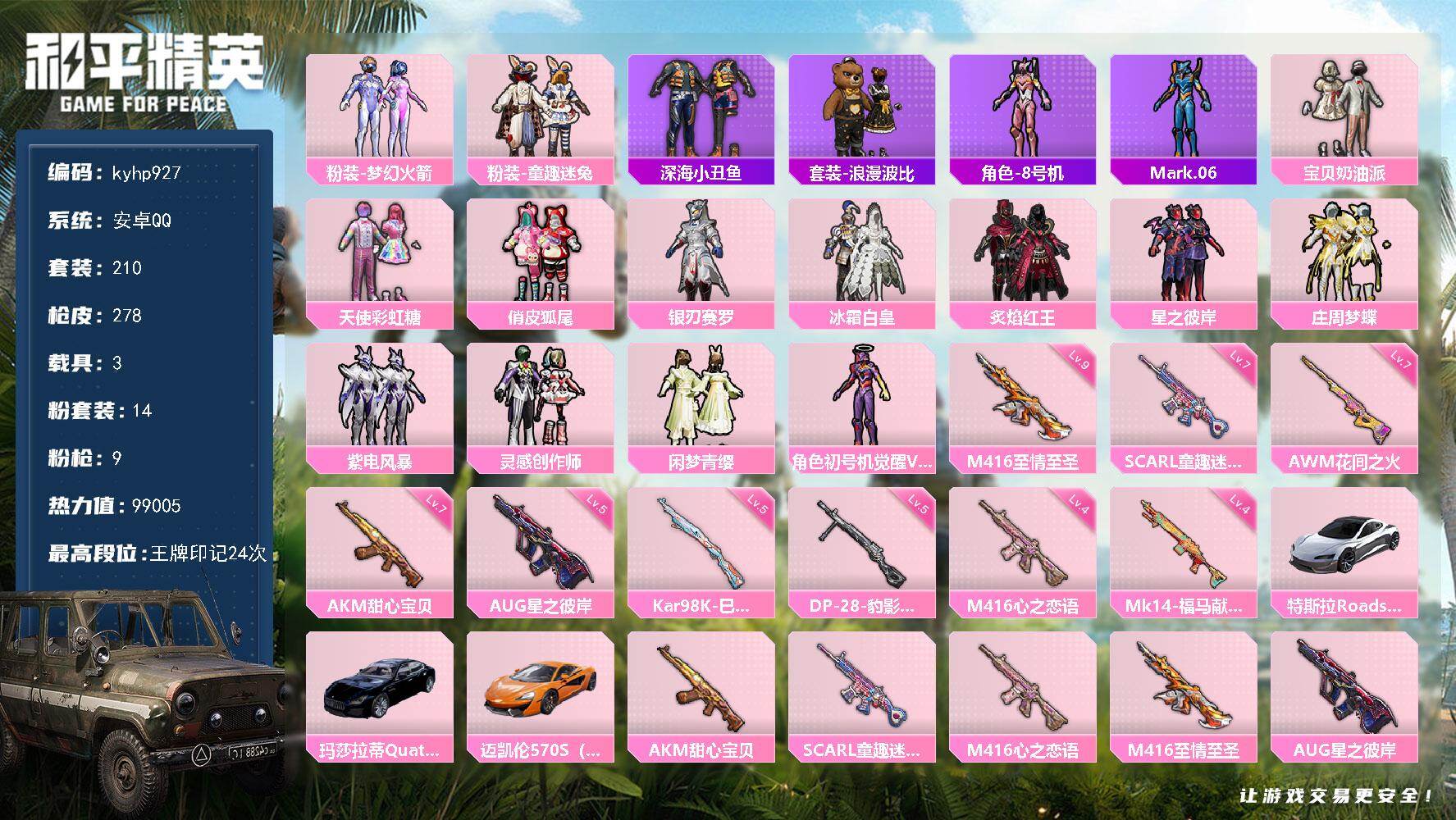 [17509670]安卓 手Q-14粉装-9特效枪-3载具-6粉色飞行器-99005热力值-24王牌印记-210套装-278枪皮