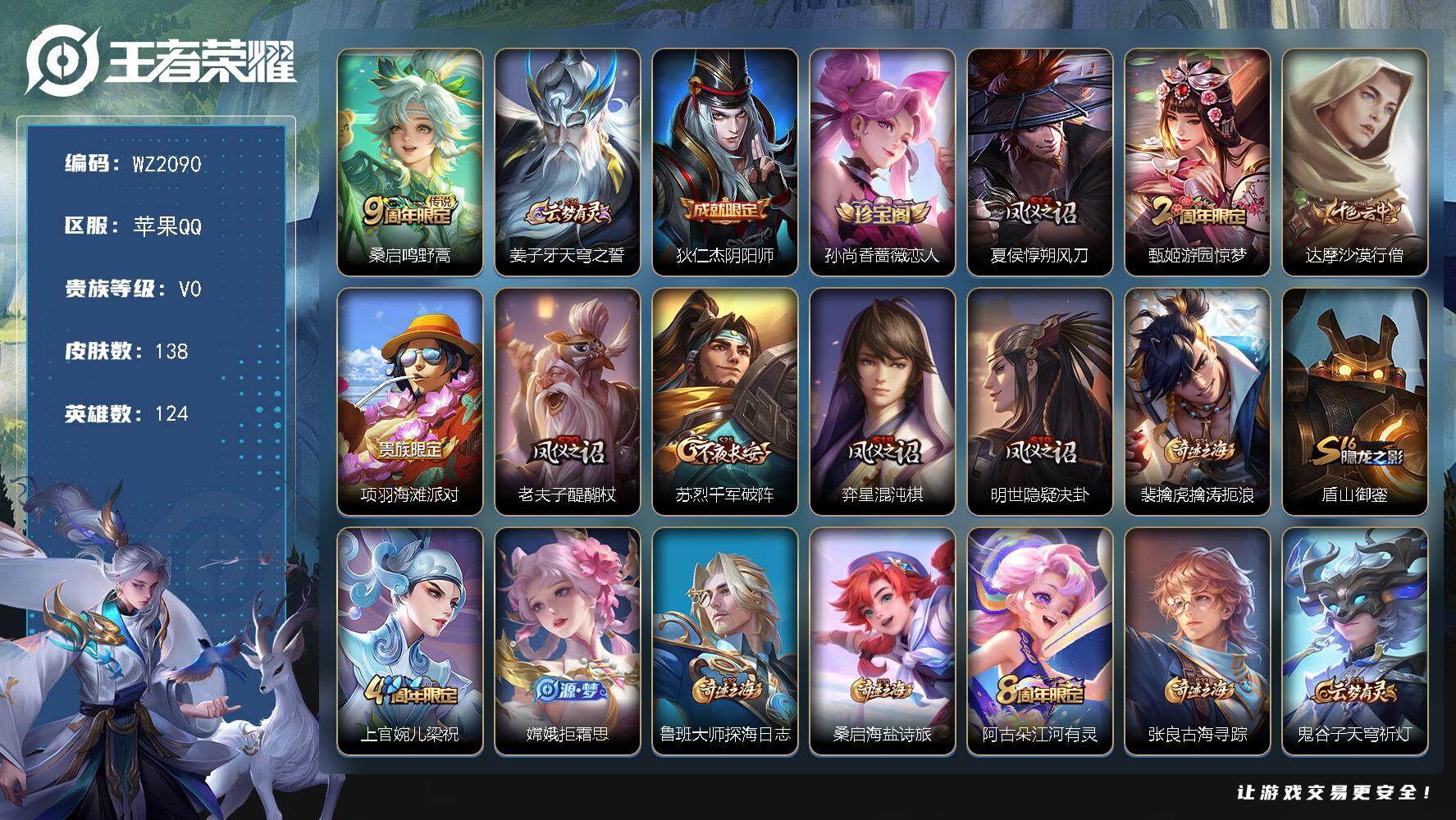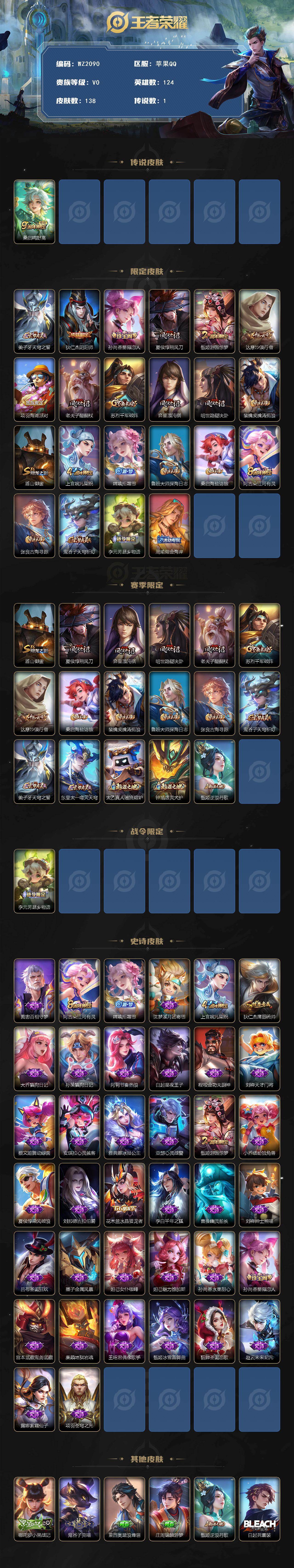 [17509737]苹果Q-138皮肤-1传说-38史诗 【传说皮肤】:桑启鸣野蒿 【限定皮肤】:姜子牙天穹之誓,狄仁杰阴阳师,孙尚香蔷薇恋人,夏侯惇朔风刀,甄姬游园惊梦,达摩沙漠行僧,项羽海滩派对,老夫子醍醐杖,苏烈千军破阵,弈星混沌棋,明世隐疑决卦,裴擒虎擒涛扼浪,盾山御銮,上官婉儿梁祝,嫦娥拒霜思,鲁班大师探海日志,桑启海盐诗旅,阿古朵江河有灵,张良古海寻踪,鬼谷子天穹祈灯,李元芳蔬乡物语,周瑜熔金海岸 【赛季限定】:盾山御銮,夏侯惇朔风刀,弈星混沌棋,明世隐疑决卦,老夫子醍醐杖,苏烈千军破阵,达摩沙漠行僧,桑启海盐诗旅,裴擒虎擒涛扼浪,鲁班大师探海日志,张良古海寻踪,鬼谷子天穹祈灯,姜子牙天穹之誓,东皇太一噬灭天穹,太乙真人谧流熔炉,钟馗虚灵犬护,甄姬逆浪荇歌 【战令限定】:李元芳蔬乡物语 【史诗皮肤】:黄忠百相守梦,阿古朵江河有灵,嫦娥拒霜思,沈梦溪月团寄思,上官婉儿梁祝,狄仁杰鹰眼统帅,大乔猫狗日记,孙策猫狗日记,阿轲节奏热浪,白起星夜王子,程咬金功夫厨神,刘禅天才门将,蔡文姬舞动绿茵,安琪拉心灵骇客,雅典娜冰冠公主,亚瑟心灵战警,甄姬游园惊梦,小乔缤纷独角兽,夏侯惇乘风破浪,刘邦德古拉伯爵,花木兰水晶猎龙者,李白千年之狐,曹操幽灵船长,刘禅绅士熊喵,吕布圣诞狂欢,墨子金属风暴,妲己女仆咖啡,妲己魅力维加斯,孙尚香水果甜心,孙尚香蔷薇恋人,宫本武藏鬼剑武藏,廉颇地狱岩魂,王昭君偶像歌手,甄姬冰雪圆舞曲,貂蝉圣诞恋歌,赵云未来纪元,露娜紫霞仙子,项羽苍穹之光 【其他皮肤】:哪吒罗小黑战记,鬼谷子克喵,莱西奥踏浪烽翎,庄周锦麟游梦,甄姬逆浪荇歌,白起死霸装,姬小满小满鸭,露娜命运加冕,阿古朵布丁狗之约,张良灵野札记,苏烈春野闲踪,钟馗虚灵犬护,刘备浪漫序章,戈娅玫蓝誓约,明世隐景韶洛都,姜子牙星梦巡礼,西施雪境奇遇,典韦铁骨偃魂,太乙真人谧流熔炉,苍苍林狼骑,干将莫邪雾都夜雨,米莱狄怪诞之夜,东皇太一噬灭天穹,盘古敬我三分,周瑜熔金海岸,姜子牙天穹之誓,李元芳蔬乡物语,嫦娥漠中幻影,鬼谷子天穹祈灯,钟无艳聚星闪耀,张良古海寻踪,鲁班大师探海日志,太乙真人劲辣红锅,裴擒虎擒涛扼浪,猪八戒潮玩探月行,海月幻泉雾影,桑启海盐诗旅,蒙恬蔚蓝守将,米莱狄契约魔法,达摩沙漠行僧,苏烈千军破阵,鲁班大师乓乓大师,露娜瓷语鉴心,狂铁特工战影,老夫子醍醐杖,明世隐疑决卦,弈星混沌棋,夏侯惇朔风