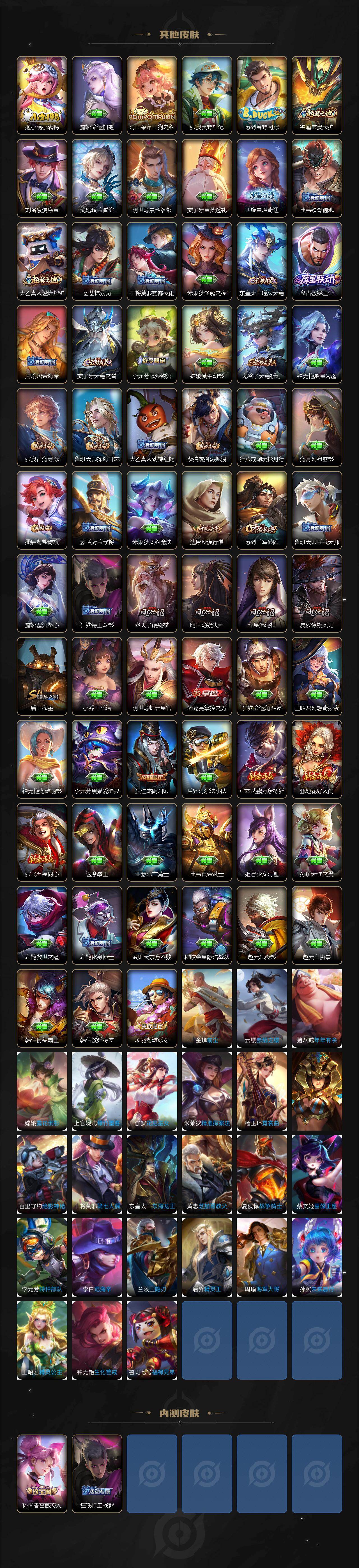 【限定皮肤】:姜子牙天穹之誓,狄仁杰阴阳师,孙尚香蔷薇恋人,夏侯惇朔风刀,甄姬游园惊梦,达摩沙漠行僧,项羽海滩派对,老夫子醍醐杖,苏烈千军破阵,弈星混沌棋,明世隐疑决卦,裴擒虎擒涛扼浪,盾山御銮,上官婉儿梁祝,嫦娥拒霜思,鲁班大师探海日志,桑启海盐诗旅,阿古朵江河有灵,张良古海寻踪,鬼谷子天穹祈灯,李元芳蔬乡物语,周瑜熔金海岸