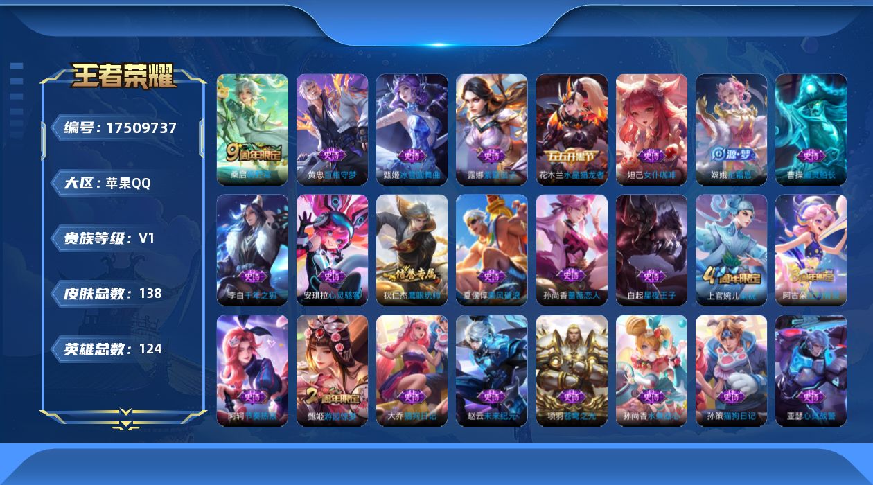 - [11527903]V10 3典藏 1无双 1珍品传说 55传说 125英雄 420皮肤 可修改实名 优质装备:无限飓风号(高达),银白咏叹调(倪克斯侍卫),神鉴启示录,韩信群星魔术团(韩信无双),黄金狮子座,黄金射手座,云鹰飞将(小将军),绛天战甲(鸡嘴战神),久胜战神,炽阳神光,一念神魔,云霓雀翎,末日机甲-孙尚香(绿蚂蚱),仲夏夜之梦(大飞蛾),音你心动-小乔,地狱之眼,飞鸢探春,胖达荣荣,乞巧织情,时之恋人-刘备(电焊工),淬星耀世,超时空战士-狄仁杰,末日机甲-孙策,无双飞将,音你闪耀(rap皮),碎云,神器·狴犴令,山海·炽霜斩(李信年限),山海·苍雷引(电光曜子),燃星之曲,画中仙,记忆之芯(机甲兔),百相守梦(张飞),惊梅引,永恒水手月亮,夜礼服假面,霜月吟,澜逐花归海,艾琳觅芳踪,琥珀纪元铠,琥珀纪元马超,涂山容容 珍品传说:兔狲·蓬尾 传说皮:祥瑞亨通,幻光神枪 珍宝阁皮:胡桃夹子,优雅恋人,蔷薇恋人 限定皮:愿照·九州拓(澜年限),逐霄战戟,鸣野蒿,夏侯惇霜北刀,傲雪梅枪,补天,星穹之声,绯月行,神威(电光马子),无限倾心-项羽,影龙天霄,遇见飞天,诗剑行,无限倾心-虞姬,匿光决锋者,怒海麟威,五谷丰年,梁祝,岱宗(典韦年限),祈雪灵祝(雪兔子),李小龙,玄武志(苏烈年限),朱雀志(守约年限),默契交锋-兰陵王,默契交锋-花木兰,引擎之心,天魔缭乱,冰霜恋舞曲,百木心枪,深海之息(深海大菠萝),神器·万象笔,梦圆繁星 史诗皮:化蝶舞,灵蛊蚀心,星界战将,谪仙醉月,龙之律动,石田雨龙,茶境仙,撼地雄心,破空之剑,蒙犽顽岩魄,琥珀纪元伽罗,百相守梦-百里守约,百相守梦-黄忠,遇见神鹿,紫霞仙子,苍穹之光,电玩小子(小书包),黄金分割率,特工魅影,千年之狐,永昼,江河有灵,真我赫兹(百里守约),魅语,百解令(蒙犽),高渐离燃音魔法,蒙恬荣光圣徽,无限星赏官,冰冠公主,青蛇,偶像歌手,白蛇,晚萤,电玩·爆裂旋风,百相守梦(刘备),暗夜猫娘,百相守梦(关羽),龙骑士(小龙虾),末日机甲-吕布,猫狗日记-孙策,猫狗日记-大乔,时之恋人-孙尚香,乱世虎臣,节奏热浪,修罗,女仆咖啡,摇滚巨星,水果甜心,绅士熊喵,天才门将,星夜王子,心灵骇客,功夫厨神,德古拉伯爵,暗隐猎兽者,幽灵船长,鬼剑武藏,暗渊魔法,心灵战警,乐园奇幻夜,舞动绿茵,地狱岩魂,诗语江南,纤云弄巧,缤纷独角兽