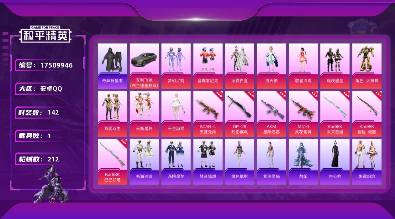 [17509946]安卓 手Q-10粉装-8特效枪-1载具-3粉色飞行器-66206热力值-10王牌印记-142套装-212枪皮 【热门品类】:粉装-梦幻火箭,粉装-音爆索尼克,套装-浪漫天命,套装-小丑鱼,套装-奇异狩猎者,角色-2P战斗服款,套装-龟仙人,套装-暗影哥特 【粉色套装】:粉装-梦幻火箭,粉装-冰霜白皇,角色-洛天依,角色-歌者泠鸢,粉装-暗夜鎏金,粉装-音爆索尼克,角色-大黄蜂,粉装-双面双生,粉装-天衡星秤,角色-千金淑猫 【粉色枪皮等级】:AKM-星际浪客(五级),SCAR-L-天蓬元帅(九级),M416-风花雪月(五级),Kar98K-未来歌姬(四级),Kar98K-创世·救赎(一级),Kar98K-巳巳如意(一级),Mk14-福马献瑞(四级),DP-28-豹影疾电(五级) 【粉色载具】:宾利飞驰(布罗德盖棕双色) 【粉色枪皮】:AKM-星际浪客,SCAR-L-天蓬元帅,M416-风花雪月,Kar98K-未来歌姬,Kar98K-创世·救赎,Kar98K-巳巳如意,Mk14-福马献瑞,DP-28-豹影疾电 【粉色飞行器】:炫彩糖果飞行器,梦幻火箭飞行器,歌者泠鸢飞行器 【粉色降落伞】:甜心宝贝降落伞,梦幻火箭降落伞,花间之火降落伞,环太平洋降落伞,青空秋雨降落伞,歌者泠鸢降落伞,暗夜鎏金降落伞,音爆索尼克降落伞,第五大道降落伞,天星战神降落伞,未来歌姬降落伞,创世·救赎降落伞,千金淑猫降落伞,宁雨蝶降落伞,绯穹魔姬降落伞,异瞳寒姬降落伞,炫彩糖果降落伞 【稀有套装】:套装-龟仙人,套装-巳巳如意,套装-雪国风尚,套装-炫彩糖果,角色-奈斯,套装-马上来财,套装-雏菊兔兔,套装-萝兰蝴蝶,套装-糖糖葫芦,套装-青团波波,套装-棉花软糖,角色-都市丽猫,角色-俏兔智灵,套装-云朵鹅,套装-雪绒豹,套装-朱霞炽焰,套装-凌霄紫焰,角色-敖闰,角色-申公豹,角色-绯色魅影,角色-紫俏灵猫,套装-书海巡游,套装-画境星梦,套装-琴音绮想,套装-雨过天青,套装-红釉青花,角色-幽雨猫猫 【稀有枪皮】:AKM-2P战斗服款,AKM-奇异狩猎者,AKM-彩虹符号,AKM-虎虎生威,AKM-龙的传人,M16A4-幻世战舞者,M16A4-莲影清波,M16A4-蓝色火焰,M16A4-千金淑猫,SCAR-L-炫彩节奏,SCAR-L-玉兔迎春,SCAR-L-甜蜜旋律,SCAR-L-红色方