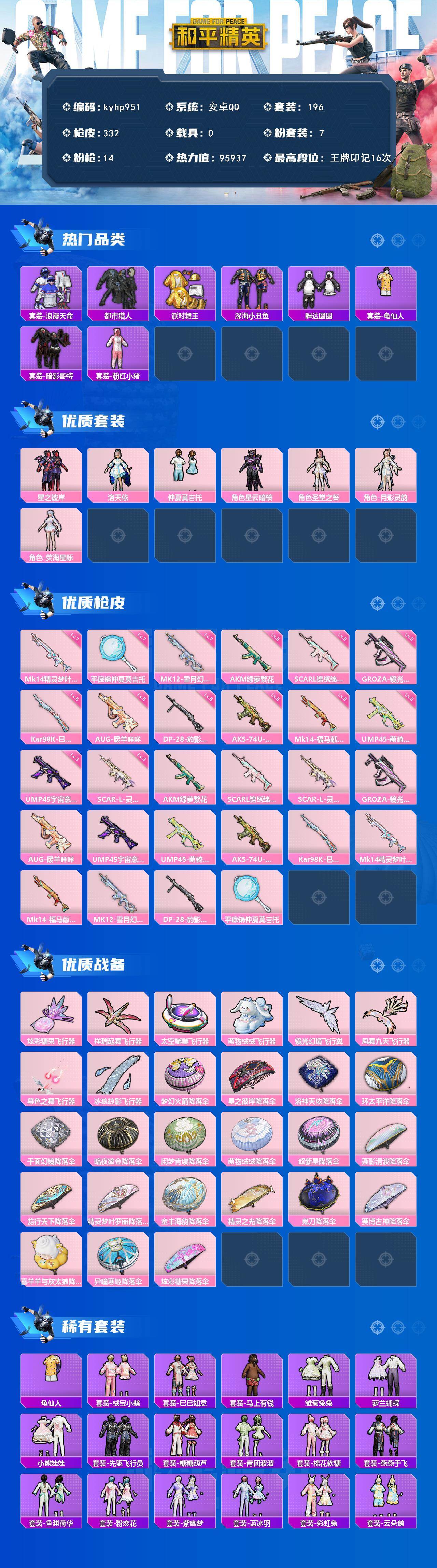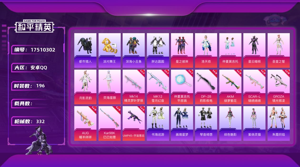 [17510302]安卓 手Q-7粉装-14特效枪-0载具-8粉色飞行器-95937热力值-16王牌印记-196套装-332枪皮 【热门品类】:套装-浪漫天命,套装-都市猎人,套装-派对舞王,套装-深海小丑鱼,套装-胖达圆圆,套装-龟仙人,套装-暗影哥特,套装-粉红小猪 【粉色套装】:粉装-星之彼岸,角色-洛天依,粉装-仲夏莫吉托,角色-星云暗核,角色-圣堂之誓,角色-月影灵韵,角色-荧海星豚 【粉色枪皮等级】:AKM-绿萝繁花(五级),SCAR-L-锦绣绵绵(五级),SCAR-L-灵驹仙姬(三级),GROZA-镜光银凌(五级),AUG-暖羊咩咩(五级),UMP45-宇宙意志(三级),UMP45-萌骑冒险(五级),AKS-74U-森灵之息(五级),Kar98K-巳巳如意(五级),Mk14-精灵梦叶罗丽(七级),Mk14-福马献瑞(五级),MK12-雪月幻音(七级),DP-28-豹影疾电(五级),平底锅-仲夏莫吉托(七级) 【粉色枪皮】:AKM-绿萝繁花,SCAR-L-锦绣绵绵,SCAR-L-灵驹仙姬,GROZA-镜光银凌,AUG-暖羊咩咩,UMP45-宇宙意志,UMP45-萌骑冒险,AKS-74U-森灵之息,Kar98K-巳巳如意,Mk14-精灵梦叶罗丽,Mk14-福马献瑞,MK12-雪月幻音,DP-28-豹影疾电,平底锅-仲夏莫吉托 【粉色飞行器】:炫彩糖果飞行器,祥瑞起舞飞行器,太空嘟嘟飞行器,萌物绒绒飞行器,镜光幻境飞行翼,凤舞九天飞行器,暮色之舞飞行器,冰狼掠影飞行器 【粉色降落伞】:梦幻火箭降落伞,星之彼岸降落伞,洛神天依降落伞,环太平洋降落伞,千面幻镜降落伞,暗夜鎏金降落伞,闲梦青缨降落伞,萌物绒绒降落伞,超新星降落伞,莲影清波降落伞,龙行天下降落伞,精灵梦叶罗丽降落伞,金丰海韵降落伞,精灵之光降落伞,鬼刀降落伞,赛博古神降落伞,喜羊羊与灰太狼降落伞,异瞳寒姬降落伞,炫彩糖果降落伞 【稀有套装】:套装-龟仙人,套装-绒宝小鹅,套装-巳巳如意,套装-雪国风尚,套装-炫彩糖果,套装-马上有钱,套装-雏菊兔兔,套装-萝兰蝴蝶,套装-小熊娃娃,套装-先驱飞行员,套装-糖糖葫芦,套装-青团波波,套装-棉花软糖,套装-燕燕于飞,套装-鱼渊荷华,套装-粉恋花,套装-紫幽梦,套装-蓝冰羽,套装-彩虹兔,套装-云朵鹅,套装-雪绒豹,角色-时希公主,套装-朱霞炽焰,套装-凌霄紫焰,套装-擎苍