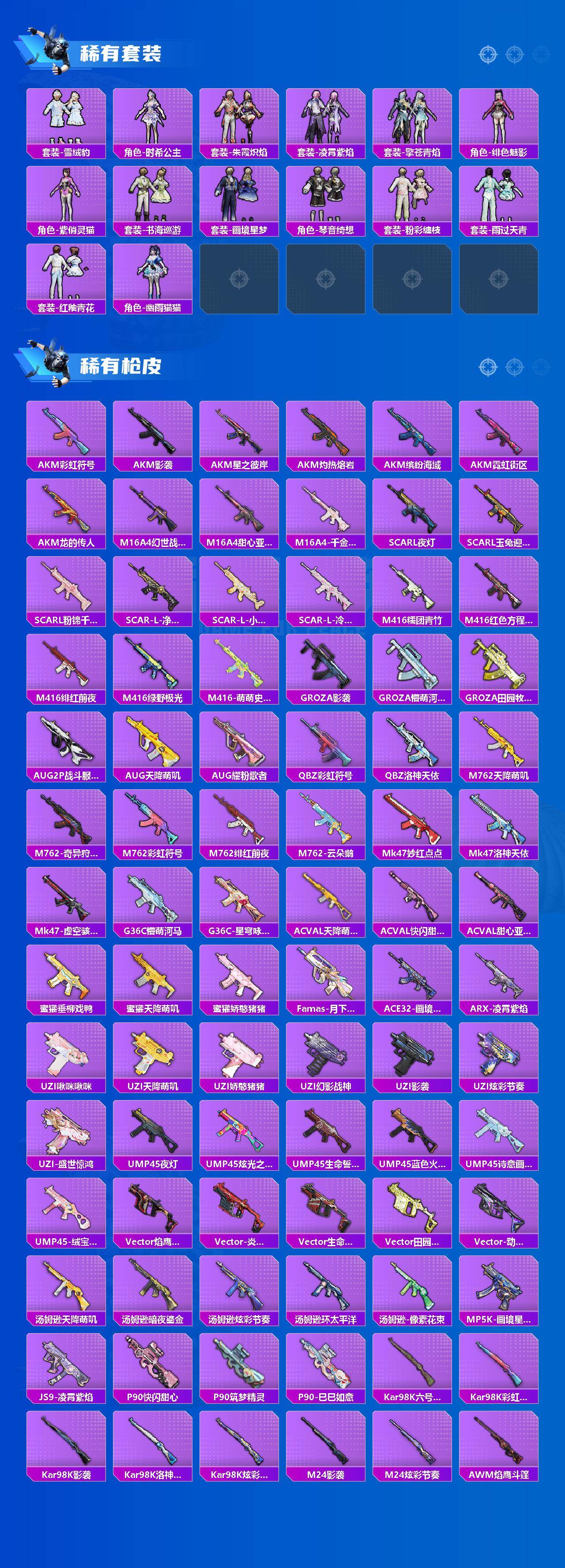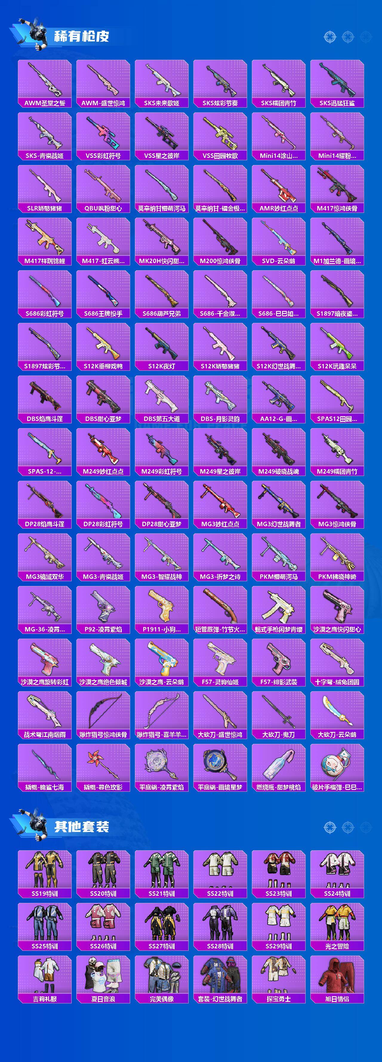 AKM-绿萝繁花,SCAR-L-锦绣绵绵,GROZA-镜光银凌,AUG-暖羊咩咩,UMP45-宇宙意志,Kar98K-巳巳如意,Mk14-精灵梦叶罗丽,MK12-雪月幻音,平底锅-仲夏莫吉托