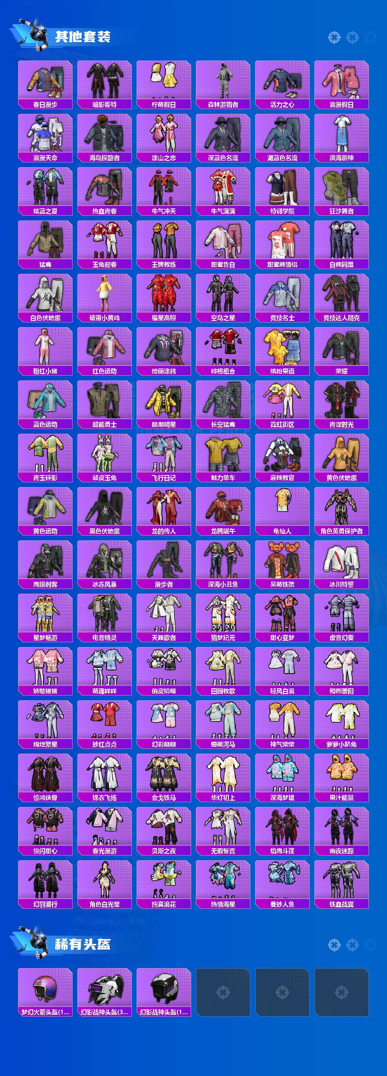 套装-都市猎人,套装-派对舞王,套装-深海小丑鱼,套装-胖达圆圆,套装-星之彼岸,角色-洛天依,套装-仲夏莫吉托,角色-星云暗核,角色-圣堂之誓,角色-月影灵韵,套装-鹰眼刺客,套装-呆萌铁蟹