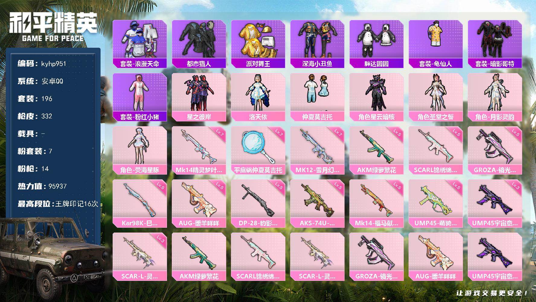 [17510302]安卓 手Q-7粉装-14特效枪-0载具-8粉色飞行器-95937热力值-16王牌印记-196套装-332枪皮