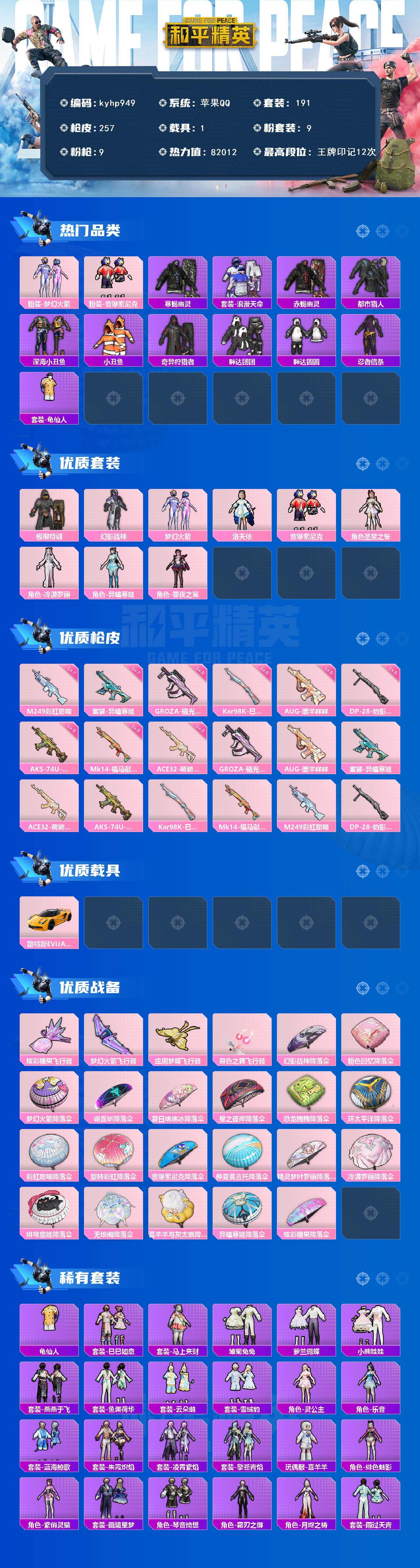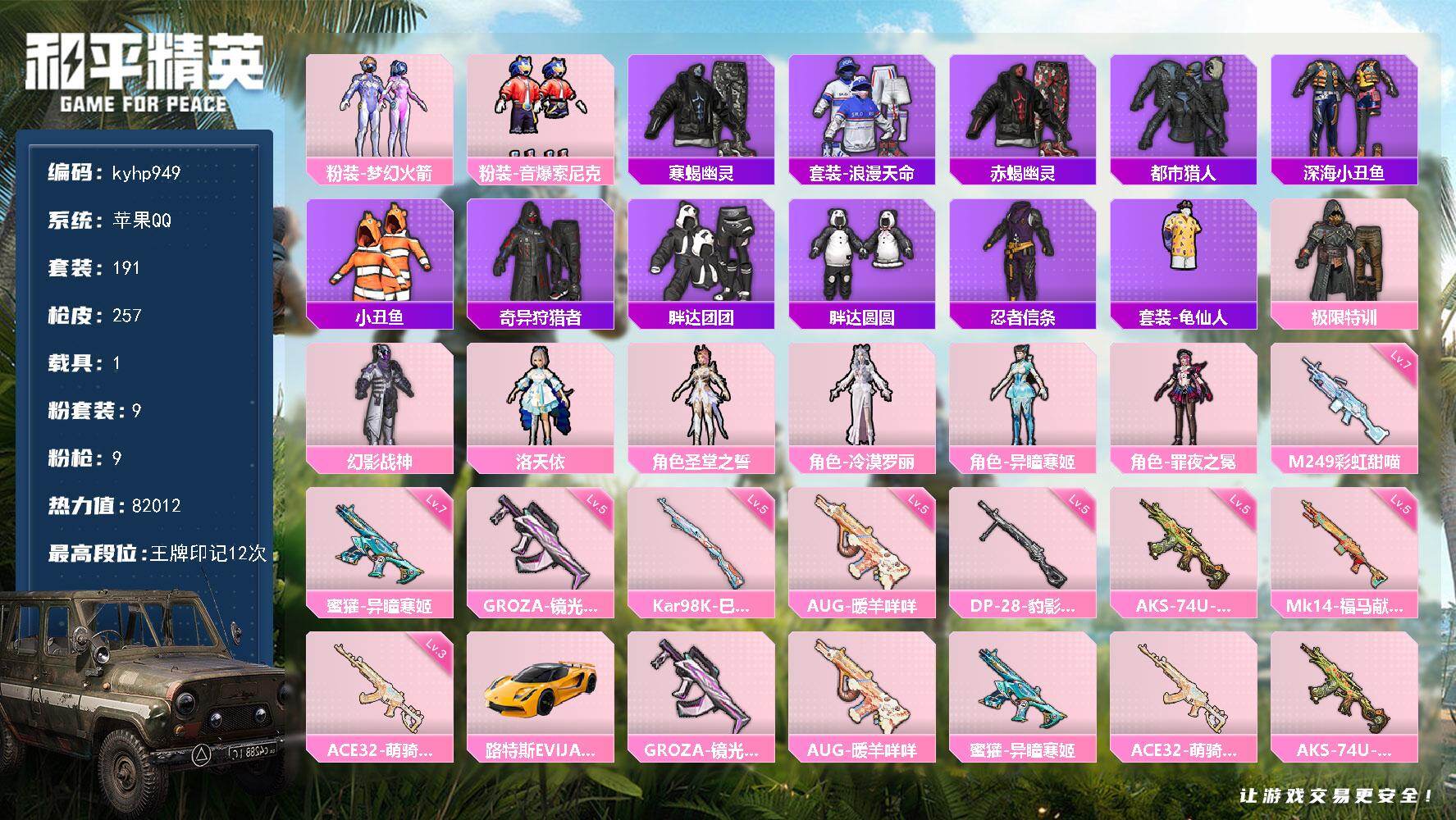 [17510203]苹果 手Q-9粉装-9特效枪-1载具-4粉色飞行器-82012热力值-12王牌印记-191套装-257枪皮 【热门品类】:粉装-梦幻火箭,粉装-音爆索尼克,套装-寒蝎幽灵,套装-浪漫天命,套装-赤蝎幽灵,套装-都市猎人,套装-深海小丑鱼,套装-小丑鱼,套装-奇异狩猎者,套装-胖达团团,套装-胖达圆圆,套装-忍者信条,套装-龟仙人 【粉色套装】:粉装-极限特训,粉装-幻影战神,粉装-梦幻火箭,角色-洛天依,粉装-音爆索尼克,角色-圣堂之誓,角色-冷漠罗丽,角色-异瞳寒姬,角色-罪夜之冕 【粉色枪皮等级】:GROZA-镜光银凌(五级),AUG-暖羊咩咩(五级),蜜獾-异瞳寒姬(七级),ACE32-萌骑漫游(三级),AKS-74U-森灵之息(五级),Kar98K-巳巳如意(五级),Mk14-福马献瑞(五级),M249-彩虹甜喵(七级),DP-28-豹影疾电(五级) 【粉色载具】:路特斯EVIJA(星际黄) 【粉色枪皮】:GROZA-镜光银凌,AUG-暖羊咩咩,蜜獾-异瞳寒姬,ACE32-萌骑漫游,AKS-74U-森灵之息,Kar98K-巳巳如意,Mk14-福马献瑞,M249-彩虹甜喵,DP-28-豹影疾电 【粉色飞行器】:炫彩糖果飞行器,梦幻火箭飞行器,庄周梦蝶飞行器,暮色之舞飞行器 【粉色降落伞】:幻影战神降落伞,粉色回忆降落伞,梦幻火箭降落伞,诡面斩降落伞,夏日绵绵冰降落伞,星之彼岸降落伞,恐龙拽拽降落伞,环太平洋降落伞,彩虹甜喵降落伞,旋转彩虹降落伞,音爆索尼克降落伞,仲夏莫吉托降落伞,精灵梦叶罗丽降落伞,冷漠罗丽降落伞,绯穹魔姬降落伞,无垠阁降落伞,喜羊羊与灰太狼降落伞,异瞳寒姬降落伞,炫彩糖果降落伞 【稀有套装】:套装-龟仙人,套装-巳巳如意,套装-雪国风尚,套装-马上来财,套装-雏菊兔兔,套装-萝兰蝴蝶,套装-小熊娃娃,套装-燕燕于飞,套装-鱼渊荷华,套装-云朵鹅,套装-雪绒豹,角色-灵公主,角色-乐音,套装-蓝海鲸歌,套装-朱霞炽焰,套装-凌霄紫焰,套装-擎苍青焰,玩偶服-喜羊羊,角色-绯色魅影,角色-紫俏灵猫,套装-画境星梦,套装-琴音绮想,角色-霜刃之御,角色-月烬之祷,套装-雨过天青,套装-红釉青花 【稀有枪皮】:AUG-冰晶雪宝,AKM-奇异狩猎者,AKM-星之彼岸,AKM-环太平洋,AKM-破晓战魂,AKM-霓虹街区,AKM-龙的传人,M16A4