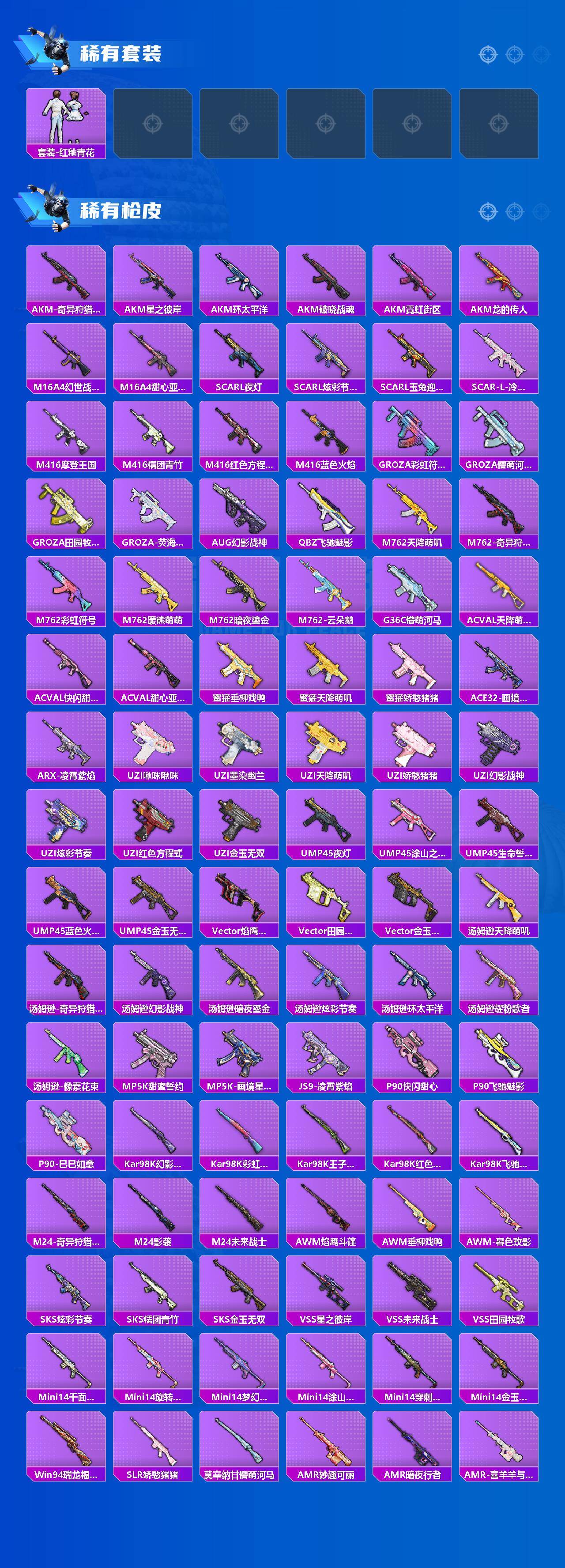 【稀有枪皮】:AUG-冰晶雪宝,AKM-奇异狩猎者,AKM-星之彼岸,AKM-环太平洋,AKM-破晓战魂,AKM-霓虹街区,AKM-龙的传人,M16A4