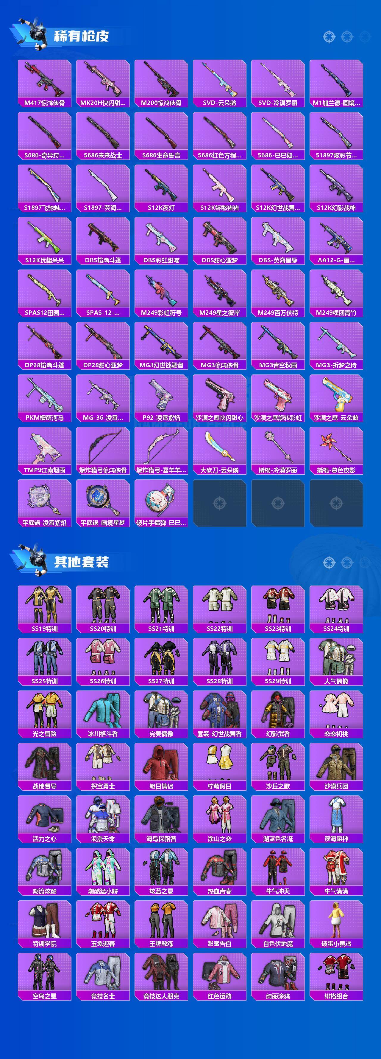 - [16502598]【特价出售/店主推荐】 苹果 微信-10粉装-4特效枪-2载具-2粉色飞行器-84785热力值-11王牌印记-197套装-247枪皮 【热门品类】:粉装-雪国幻梦,套装-浪漫天命,套装-深海小丑鱼,套装-小丑鱼,套装-龟仙人,套装-暗影哥特,套装-浪漫波比,套装-萌熊伴侣,套装-糯粉咩咩 【粉色套装】:粉装-守护骑士,粉装-甜心巧克力,粉装-雪国幻梦,粉装-智能音符,粉装-放客神游,粉装-王牌四分卫,粉装-碧影闪光,粉装-未来歌姬,粉装-夜幕颂歌,套装-创世·救赎 【粉色枪皮等级】:AKM-梦之光华(七级),M416-五爪金龙(七级),M416-风花雪月(四级),Kar98K-巳巳如意(四级) 【粉色载具】:兰博基尼Aventador SVJ(翡翠绿),玛莎拉蒂Ghibli(蓝) 【粉色枪皮】:AKM-梦之光华,M416-五爪金龙,M416-风花雪月,Kar98K-巳巳如意 【粉色飞行器】:纯梦嫁纱飞行翼 【粉色降落伞】:粉色回忆降落伞,春暖花开降落伞,PEL轰鸣竞梦者降落伞,甜蜜誓约降落伞,激战未来降落伞,银刃赛罗降落伞,香水柠檬降落伞,王牌四分卫降落伞,星之彼岸降落伞,暗夜玫瑰降落伞,恐龙拽拽降落伞,冰川粉黛降落伞,音爆索尼克降落伞,飒粉甜心降落伞,未来歌姬降落伞,炫光之旅降落伞,莲影清波降落伞,小叽联名款降落伞,精灵梦叶罗丽降落伞,喜羊羊与灰太狼降落伞,炫彩糖果降落伞 【稀有套装】:套装-龟仙人,套装-绒宝小鹅,套装-巳巳如意,套装-炫彩糖果,套装-雏菊兔兔,套装-萝兰蝴蝶,角色-许七安,套装-燕燕于飞,套装-鱼渊荷华,套装-闪电轻猫 【稀有枪皮】:AKM-夜灯,AKM-天启纪元,AKM-彩虹符号,AKM-星之彼岸,AKM-江南烟雨,AKM-灼热熔岩,AKM-生命誓言,AKM-缤纷海域,AKM-萌趣颜团子,AKM-霓虹街区,AKM-龙的传人,M16A4-夜灯,M16A4-幻世战舞者,SCAR-L-炫彩节奏,SCAR-L-红色方程式,SCAR-L-黄金龙骨,M416-仓鼠灰灰,M416-暗星紫秘,M416-梨园星光,M416-糯团青竹,M416-蓝色火焰,GROZA-异彩先驱,GROZA-彩虹符号,GROZA-影袭,GROZA-懵萌河马,GROZA-梨园星光,GROZA-治愈之星,AUG-天降萌叽,AUG-青春冒险家,QBZ-原初圣火,QBZ-未来歌姬,QBZ