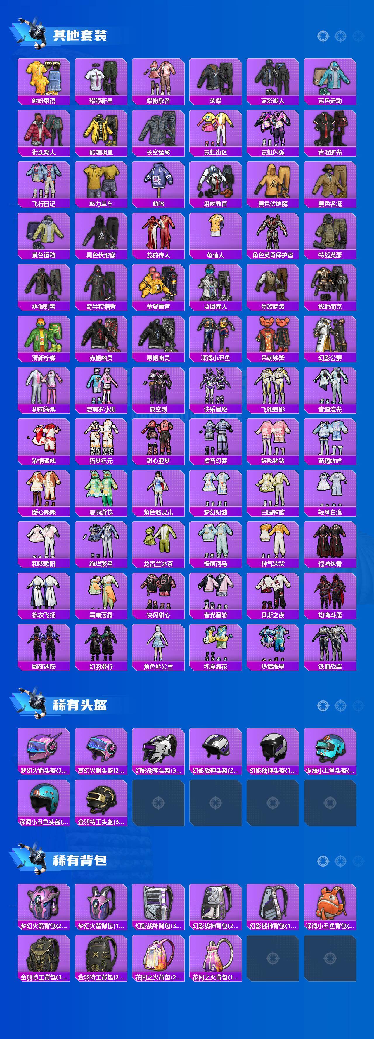 - [11854839]3粉装 2特效枪 2载具 4印记 可二次 可修改实名 社交场景限制 优质装备:合金龙骨(绿),玛莎拉蒂Quattroporte(夜幕蓝),缤纷油彩(猪妹猪脸妹),AKM星际浪客 热门装扮:纯珍童话,莲影清波 载具:僚机-萌兔起飞 稀有枪皮:DP-28-豹影疾电 六级特效枪:六级AKM-星际浪客 五级特效枪:五级DP-28-豹影疾电 紫色装扮:田园牧歌,轻风白浪,和煦暖阳,SS22特训,白啸长虹,SS23特训,幻彩翩翩,妙红点点,摩登艾咪,娇憨猪猪,萌趣咩咩,SS21特训,绚烂繁星,冰川特警,云朵鹅,雪绒豹,SS33特训套装,顶瓜瓜,乐音,青年教官,缤纷果语,蓝彩潮人,飞行日记,魅力单车,麻辣教官,黄色运动,龟仙人,极地朋克,柠萌假日,深蓝色名流,绮丽涂鸦,白熊同盟,热血骑手,猛禽,异域银装,竞技名士,SS24特训(SS24特训套装),锦衣飞扬,SS27特训,明鸳圣池,浪漫天命,SS26特训,春光漫游,快闪甜心,大橘大利,星影赞美诗,粉恋花,蓝冰羽,紫幽梦,SS32特训服(SS32特训套装),萌黄之夏,漫步者,弄潮海豚,光之冒险,银月精灵 优质战备:莲影清波降落伞,幻彩电音降落伞,海螺星光降落伞,彩虹甜喵降落伞,暗夜鎏金降落伞,梦幻火箭降落伞