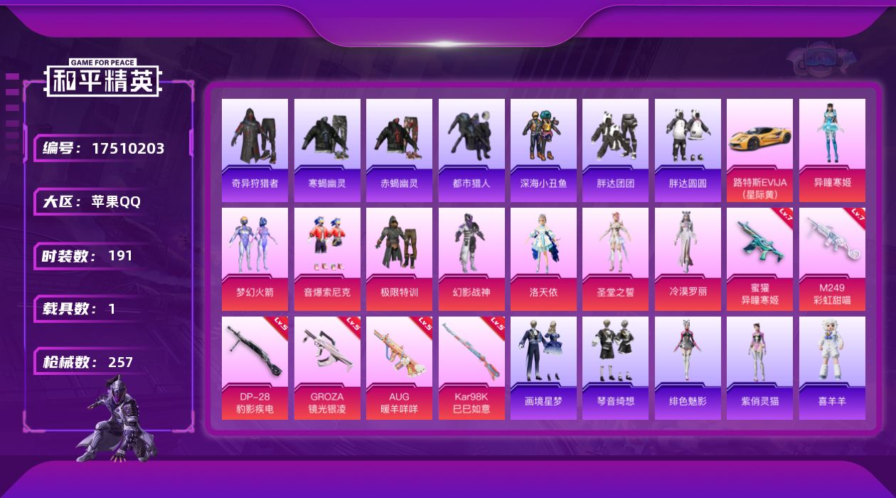 [17510203]苹果 手Q-9粉装-9特效枪-1载具-4粉色飞行器-82012热力值-12王牌印记-191套装-257枪皮
