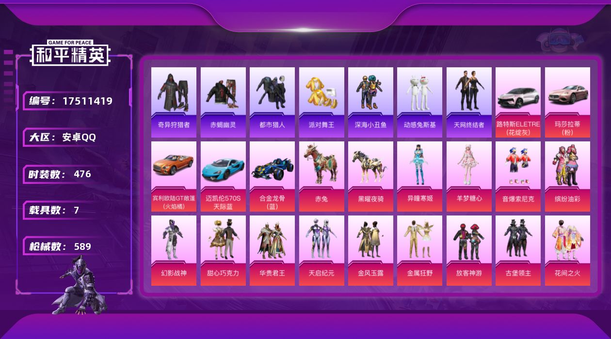 [17511419]安卓 手Q-无敌战神框-43粉装-25特效枪-7载具-13粉色飞行器-232837热力值-31王牌印记-476套装-589枪皮