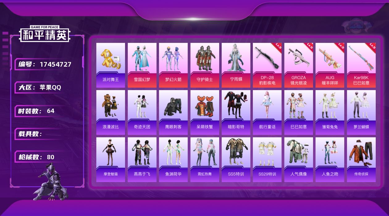 [17454727]苹果 手Q-4粉装-7特效枪-0载具-0粉色飞行器-24921热力值-3王牌印记-64套装-80枪皮 【热门品类】:粉装-雪国幻梦,粉装-梦幻火箭,套装-派对舞王,套装-AG战队服,套装-暗影哥特,套装-浪漫波比 【粉色套装】:粉装-守护骑士,粉装-雪国幻梦,粉装-梦幻火箭,角色-宁雨蝶 【粉色枪皮等级】:GROZA-镜光银凌(五级),AUG-暖羊咩咩(五级),AKS-74U-森灵之息(四级),Kar98K-巳巳如意(五级),Mk14-福马献瑞(五级),AA12-G-萌骑幻想(二级),DP-28-豹影疾电(五级) 【粉色枪皮】:GROZA-镜光银凌,AUG-暖羊咩咩,AKS-74U-森灵之息,Kar98K-巳巳如意,Mk14-福马献瑞,AA12-G-萌骑幻想,DP-28-豹影疾电 【粉色降落伞】:雪国幻梦降落伞,梦幻火箭降落伞,拳皇·狂花道降落伞,赛博古神降落伞,樱桃泡泡降落伞 【稀有套装】:套装-航行童话,套装-巳巳如意,套装-马上有钱,套装-雏菊兔兔,套装-萝兰蝴蝶,角色-摩登魅猫,套装-燕燕于飞,套装-鱼渊荷华,套装-霓虹热舞,套装-雨过天青,套装-红釉青花 【稀有枪皮】:AKM-影袭,AKM-破晓战魂,M16A4-千金淑猫,SCAR-L-炫彩节奏,M416-红色方程式,GROZA-影袭,GROZA-银河战甲,AUG-甜蜜菠萝,AUG-耀粉歌者,M762-天降萌叽,M762-奇异狩猎者,G36C-雪国精灵,UZI-影袭,UZI-幻影飞狐,UMP45-蓝色火焰,Vector-生命誓言,汤姆逊-耀粉歌者,P90-巳巳如意,Kar98K-影袭,Kar98K-梦幻火箭,M24-影袭,SKS-炫彩节奏,Mini14-梦幻火箭,S686-巳巳如意,S686-千金淑猫,S12K-玩趣呆呆,S12K-破晓战魂,M249-破晓战魂,蝎式手枪-千金淑猫,破片手榴弹-巳巳如意 【其他套装】:套装-SS5特训,套装-SS29特训,套装-人气偶像,套装-人鱼之吻,套装-传奇侦探,套装-奇迹天团,套装-暗影哥特,套装-滨海厨神,套装-王牌教练,套装-疯狂小兔子,套装-破蛋小黄鸡,套装-竞技名士,套装-缤纷假日,套装-缤纷果语,套装-蓝彩潮人,套装-长空猛禽,套装-魅力单车,套装-鹤鸣,套装-鹰眼刺客,套装-冰冻风暴,套装-漫步者,套装-呆萌铁蟹,套装-雪山精英,套装-维京奇缘,套装-浪
