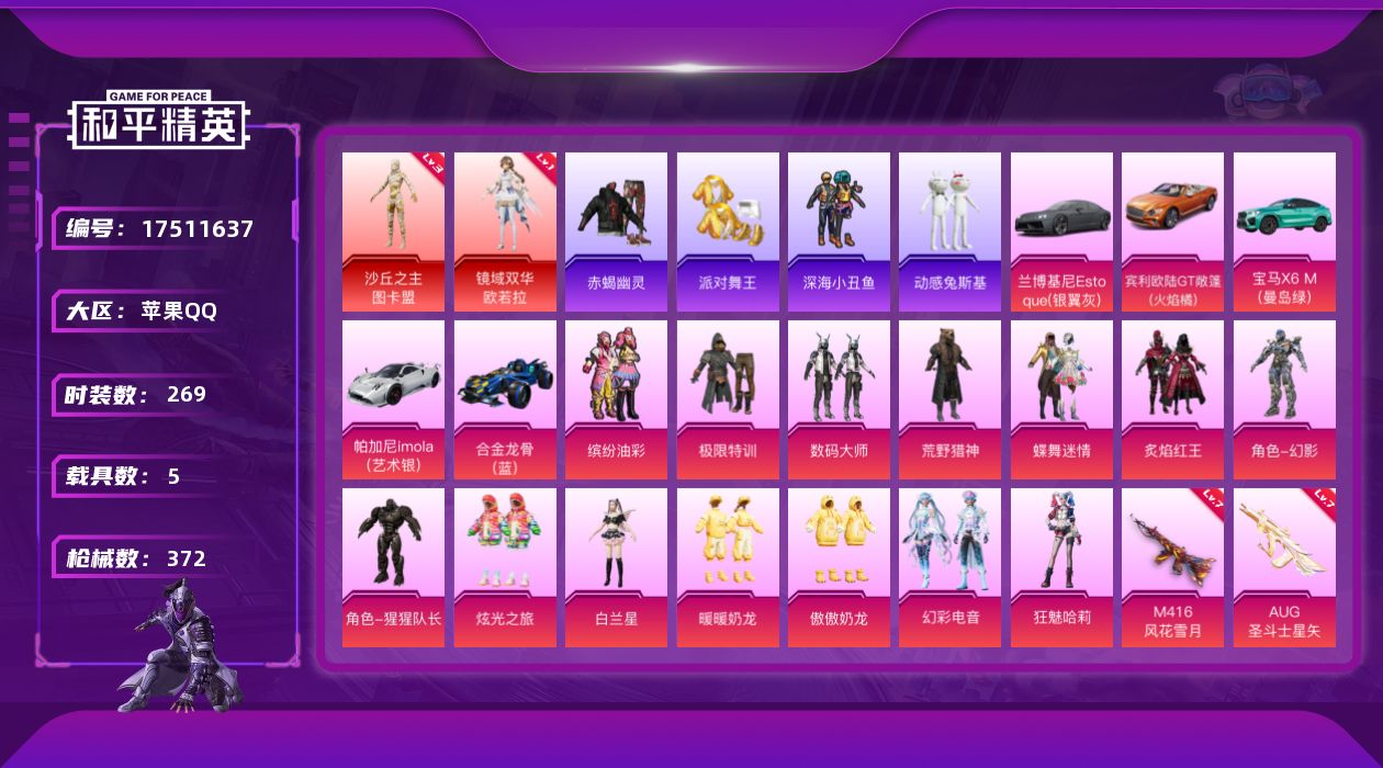 [17511637]【店主推荐捡漏号】苹果 手Q-2神装-15粉装-14特效枪-5载具-14粉色飞行器-132865热力值-19王牌印记-269套装-372枪皮【红色神装等级】:镜域双华-欧若拉(一级),沙丘之主-图卡盟(三级)【红色角色神装】:镜域双华-欧若拉,沙丘之主-图卡盟【热门品类】:粉装-缤纷油彩,套装-浪漫天命,套装-赤蝎幽灵,套装-派对舞王,套装-深海小丑鱼,套装-动感兔斯基人偶服,套装-龟仙人,套装-暗影哥特,套装-粉红小猪,套装-红红火火,套装-红熊茄茄【粉色套装】:粉装-极限特训,粉装-数码大师,粉装-荒野猎神,粉装-蝶舞迷情,粉装-缤纷油彩,粉装-炙焰红王,角色-幻影,角色-猩猩队长,粉装-炫光之旅,角色-白兰星,粉装-暖暖奶龙,粉装-傲傲奶龙,粉装-幻彩电音,角色-狂魅哈莉【粉色枪皮等级】:AKM-炫紫旋律(六级),AKM-绿萝繁花(五级),AKM-暮色玫影(三级),M416-五爪金龙(二级),M416-风花雪月(七级),M416-墨龙九天(六级),AUG-圣斗士星矢(七级),AKS-74U-森灵之息(五级),Kar98K-巳巳如意(五级),Mk14-甜梦熊击(五级),Mk14-福马献瑞(五级),DP-28-豹影疾电(五级),破片手榴弹-美味星星糖(六级)【粉色载具】:兰博基尼Estoque(银翼灰),宾利欧陆GT敞篷(火焰橘),宝马X6 M(曼岛绿),帕加尼imola(艺术银),合金龙骨(蓝)【粉色枪皮】:AKM-炫紫旋律,AKM-绿萝繁花,AKM-暮色玫影,M416-五爪金龙,M416-风花雪月,M416-墨龙九天,AUG-圣斗士星矢,AKS-74U-森灵之息,Kar98K-巳巳如意,Mk14-甜梦熊击,Mk14-福马献瑞,DP-28-豹影疾电,烟雾弹-猫咪绅士,破片手榴弹-美味星星糖