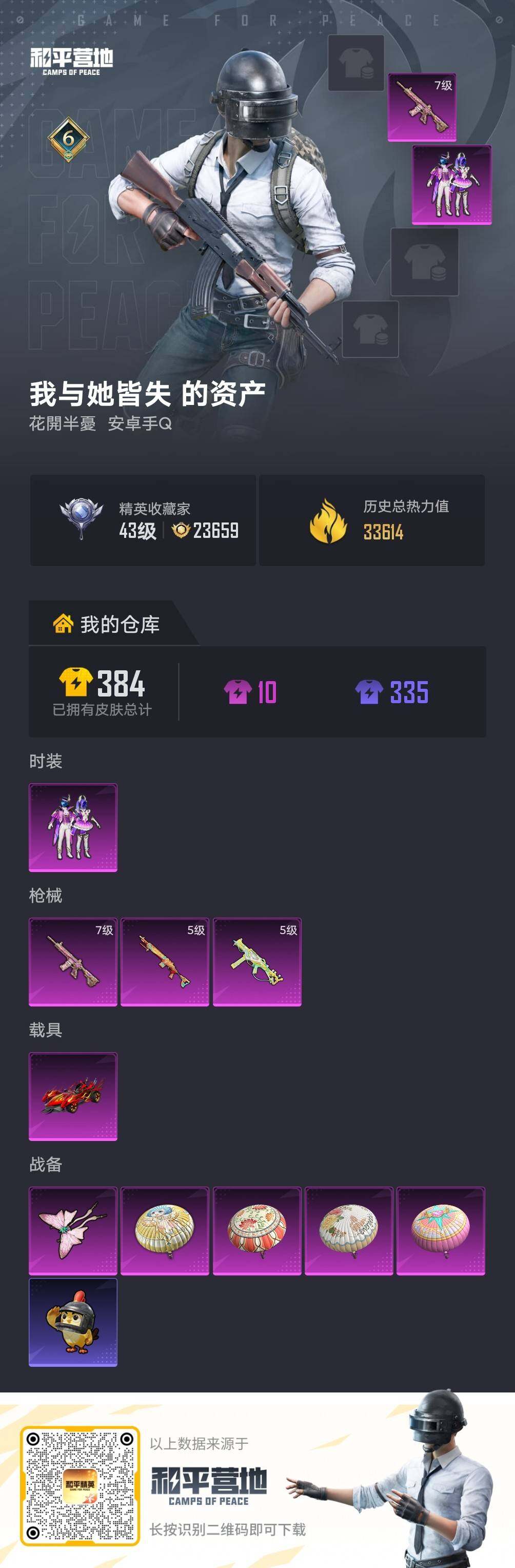- [16330042][特价出售/店主推荐]安卓 手Q-1粉装-8特效枪-0载具-0粉色飞行器-31097热力值-2王牌印记-71套装-104枪皮 【热门品类】:套装-龟仙人,角色-Mark.06 【粉色套装】:角色-萨利娅 【粉色枪皮等级】:M416-电玩时刻(五级),GROZA-镜光银凌(五级),AUG-暖羊咩咩(五级),M762-青锋波束(五级),UMP45-量子极限(五级),Kar98K-巳巳如意(五级),Mk14-甜梦熊击(五级),DP-28-豹影疾电(五级) 【粉色枪皮】:M416-电玩时刻,GROZA-镜光银凌,AUG-暖羊咩咩,M762-青锋波束,UMP45-量子极限,Kar98K-巳巳如意,Mk14-甜梦熊击,DP-28-豹影疾电 【粉色降落伞】:古堡领主降落伞,创世·救赎降落伞,千金淑猫降落伞,无垠阁降落伞 【稀有套装】:套装-龟仙人,套装-绒宝小鹅,套装-巳巳如意,套装-雏菊兔兔,套装-萝兰蝴蝶,角色-多纳泰罗,套装-糖糖葫芦,套装-青团波波,套装-棉花软糖,角色-摩登魅猫,套装-燕燕于飞,套装-鱼渊荷华,角色-风玲,角色-紫俏灵猫 【稀有枪皮】:AKM-破晓战魂,M16A4-幻世战舞者,SCAR-L-炫彩节奏,M416-蓝色火焰,GROZA-生命誓言,AUG-天降萌叽,AUG-甜蜜菠萝,QBZ-彩虹符号,M762-牛气冲天,AC-VAL-天降萌叽,蜜獾-天降萌叽,UZI-天降萌叽,UMP45-生命誓言,UMP45-电音之王,UMP45-绒宝小鹅,Vector-焰鹰斗篷,Vector-暗夜玫瑰,汤姆逊-天降萌叽,AKS-74U-鬼刀,P90-巳巳如意,Kar98K-红色方程式,M24-幻彩电音,AWM-焰鹰斗篷,SKS-炫彩节奏,Mini14-炫彩节奏,Mini14-马卡龙,AMR-鬼刀,S686-红色方程式,S686-巳巳如意,S12K-破晓战魂,S12K-夜灯,DBS-焰鹰斗篷,M249-破晓战魂,DP-28-焰鹰斗篷,DP-28-彩虹符号,MG3-幻世战舞者,大砍刀-鬼刀,破片手榴弹-巳巳如意 【其他套装】:套装-NV战队服,套装-SS12特训,套装-SS18特训,套装-SS19特训,套装-SS20特训,套装-SS27特训,套装-SS28特训,套装-SS29特训,套装-幻影武者,套装-森林游猎者,套装-海岛探路者,套装-牛气冲天,套装-牛气满满,套装-特殊使