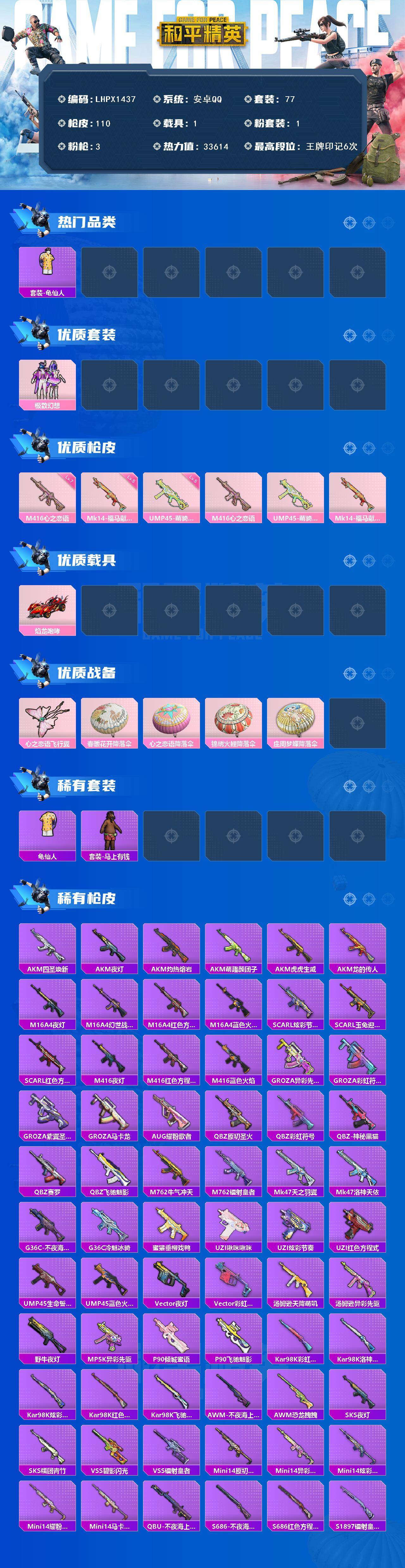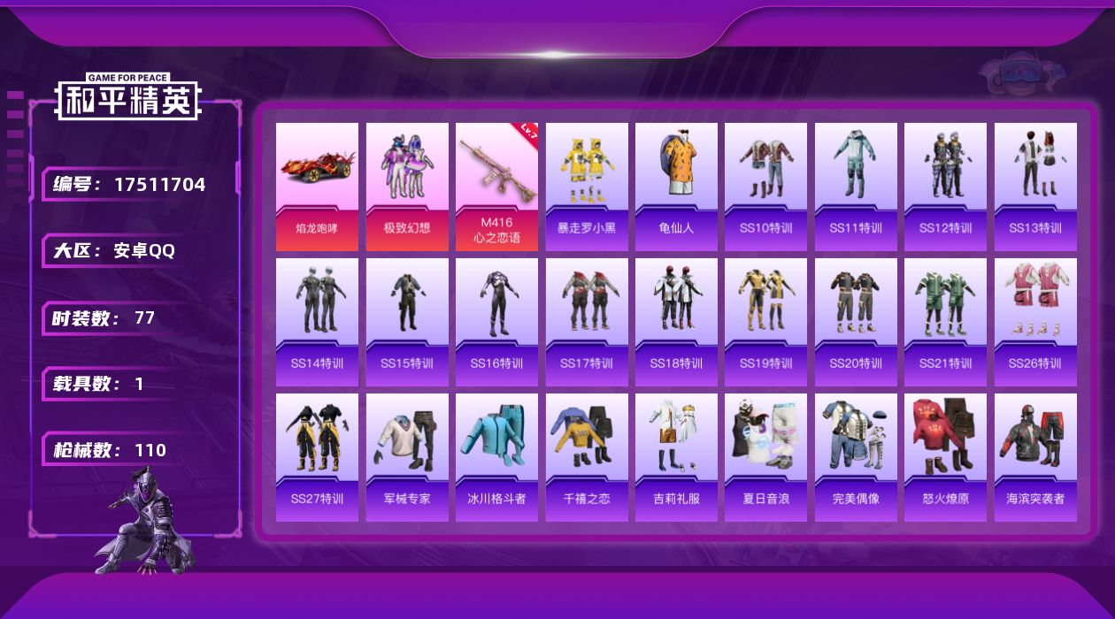 [17511704]安卓 手Q-1粉装-3特效枪-1载具-1粉色飞行器-33614热力值-6王牌印记-77套装-110枪皮【热门品类】:套装-龟仙人【粉色套装】:粉装-极致幻想【粉色枪皮等级】:M416-心之恋语(七级),UMP45-萌骑冒险(五级),Mk14-福马献瑞(五级)【粉色载具】:焰龙咆哮【粉色枪皮】:M416-心之恋语,UMP45-萌骑冒险,Mk14-福马献瑞【粉色飞行器】:心之恋语飞行翼