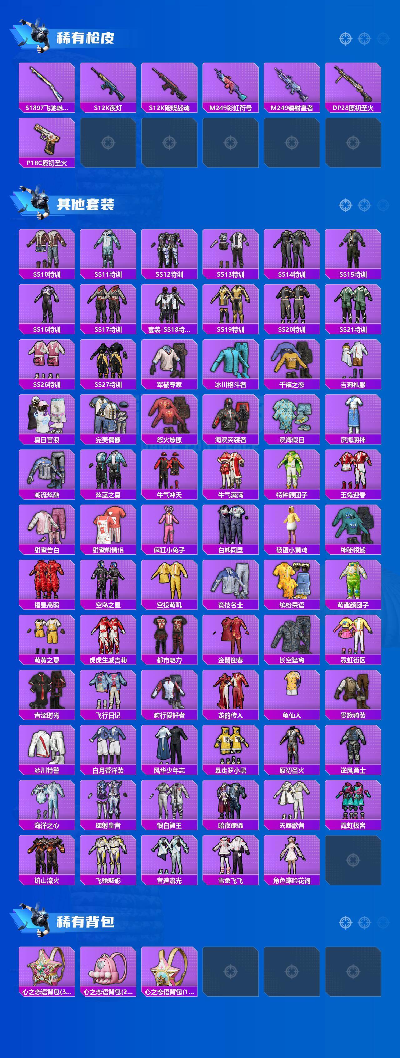 - [16331188]都市赤蝎金鞋1010素材号!【特价出售/店主推荐】苹果 微信-2粉装-3特效枪-1载具-0粉色飞行器-23674热力值-3王牌印记-51套装-78枪皮 【热门品类】:粉装-梦幻火箭,套装-赤蝎幽灵,套装-都市猎人,套装-派对舞王,角色-8号机,角色-Mark.06 【粉色套装】:粉装-梦幻火箭,粉装-雪月幻音 【粉色枪皮等级】:UMP45-宇宙意志(三级),Kar98K-巳巳如意(五级),平底锅-林间仙鹿(三级) 【粉色载具】:星梦玉骢 【粉色枪皮】:UMP45-宇宙意志,Kar98K-巳巳如意,平底锅-林间仙鹿 【粉色降落伞】:梦幻火箭降落伞,沙丘之主降落伞,星梦奇缘降落伞,初号机 觉醒Ver.降落伞,金丰海韵降落伞 【稀有套装】:套装-雏菊兔兔,套装-萝兰蝴蝶,套装-小熊娃娃,套装-糖糖葫芦,套装-青团波波,角色-怀庆长公主,套装-燕燕于飞,套装-鱼渊荷华,套装-星影赞美诗,套装-虚空漩涡,角色-紫俏灵猫 【稀有枪皮】:AKM-影袭,SCAR-L-炫彩节奏,GROZA-影袭,AUG-天降萌叽,AUG-甜蜜菠萝,AUG-耀粉歌者,QBZ-绒兔团圆,M762-天降萌叽,G36C-镜域双华,UZI-影袭,UMP45-生命誓言,汤姆逊-环太平洋,P90-巳巳如意,Kar98K-影袭,Kar98K-梦幻火箭,Kar98K-星穹咏叹调,M24-影袭,Mini14-梦幻火箭,Mini14-炫彩节奏,Mini14-生命誓言,S686-未来战士,S686-巳巳如意,MG3-幻世战舞者,撬棍-沙丘之主权杖,破片手榴弹-巳巳如意 【其他套装】:套装-S6赛事,套装-SS27特训,套装-SS28特训,套装-SS29特训,套装-决胜时刻,套装-春日漫步,套装-活力之心,套装-猛禽,套装-破晓情侣,套装-竞技名士,套装-绮丽涂鸦,套装-鹤鸣,套装-鹰眼刺客,套装-冰冻风暴,套装-漫步者,套装-赤蝎幽灵,套装-纯真浪花,套装-热情海星,角色-粉雾星云,角色-极地流光,角色-8号机,角色-Mark.06,套装-湖畔霞光,套装-粉日山川 【稀有头盔】:梦幻火箭头盔(3级),梦幻火箭头盔(2级),梦幻火箭头盔(1级) 【稀有背包】:梦幻火箭背包(3级),梦幻火箭背包(2级),梦幻火箭背包(1级) 【营地ID】:403287528
