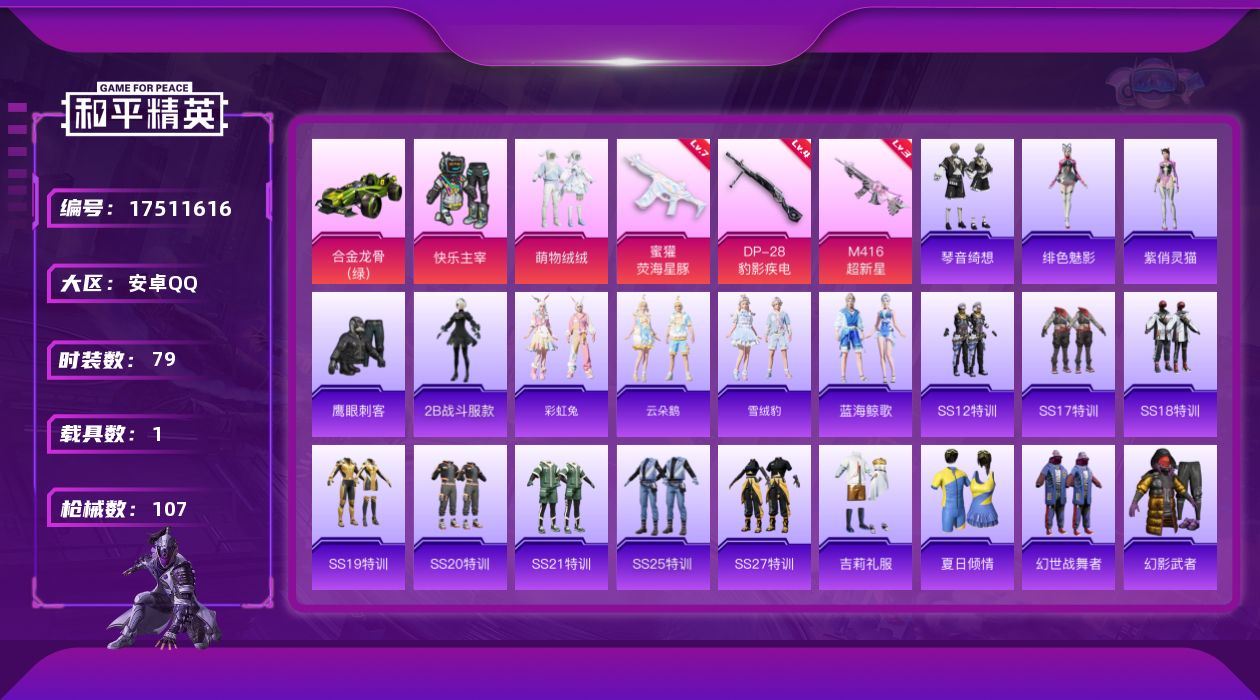 [17511616]安卓 手Q-2粉装-8特效枪-1载具-1粉色飞行器-36585热力值-2王牌印记-79套装-107枪皮