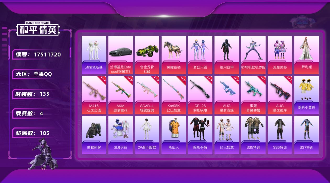 [17511720]苹果 手Q-8粉装-12特效枪-4载具-7粉色飞行器-67648热力值-11王牌印记-135套装-185枪皮