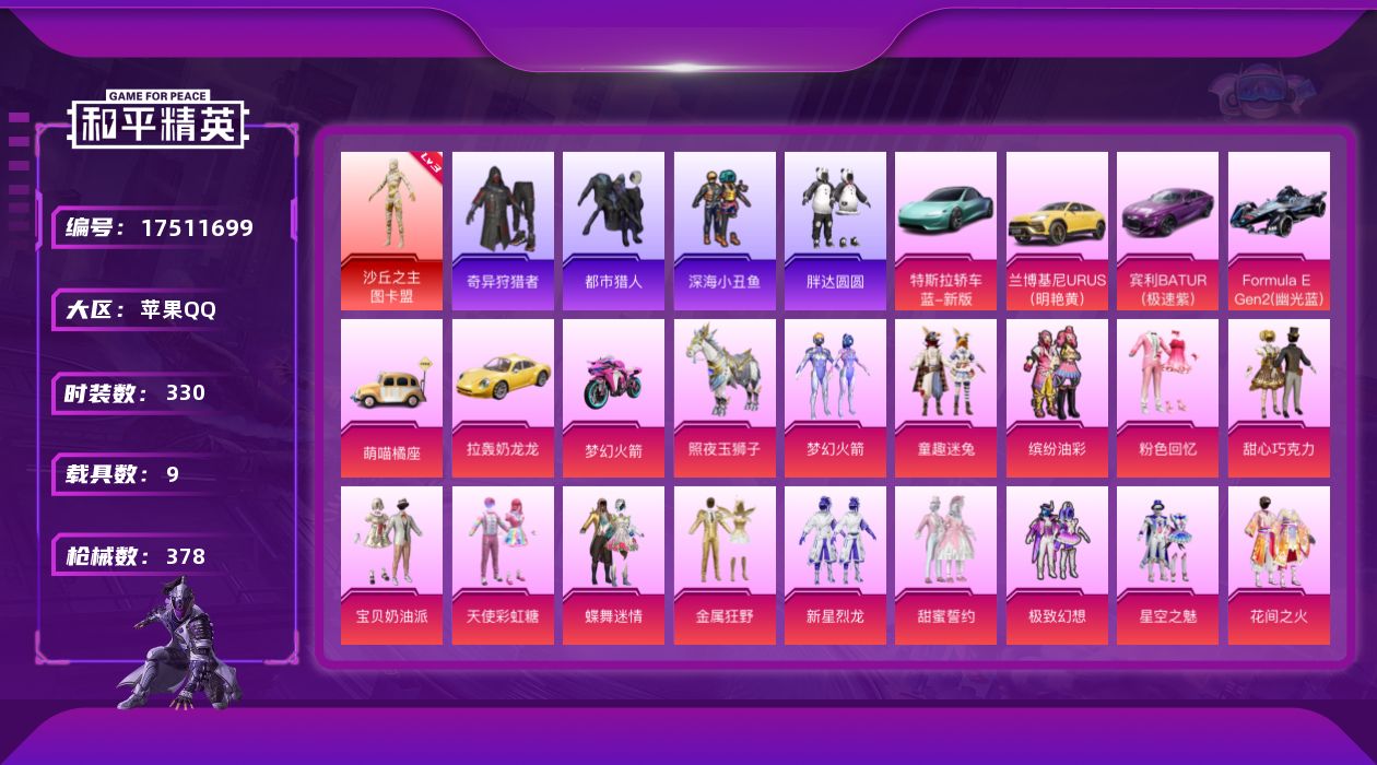 【粉色载具】:特斯拉Roadster(水滴蓝),兰博基尼URUS(明艳黄),宾利BATUR(极速紫),Formula E Gen2(幽光蓝),萌喵橘座,拉轰奶龙龙,双人摩托-梦幻火箭,空客H135-蔚蓝之翼,照夜玉狮子【粉色枪皮】:M416-五爪金龙,M416-风花雪月,GROZA-旋转彩虹,AUG-星之彼岸,P90-沙丘之主,Kar98K-巳巳如意,Mk14-福马献瑞,DP-28-豹影疾电,MG3-洛神天依【粉色飞行器】:炫彩糖果飞行器,梦幻火箭飞行器,夏日绵绵冰飞行器,绮梦青鸾飞行器,星之彼岸飞行器