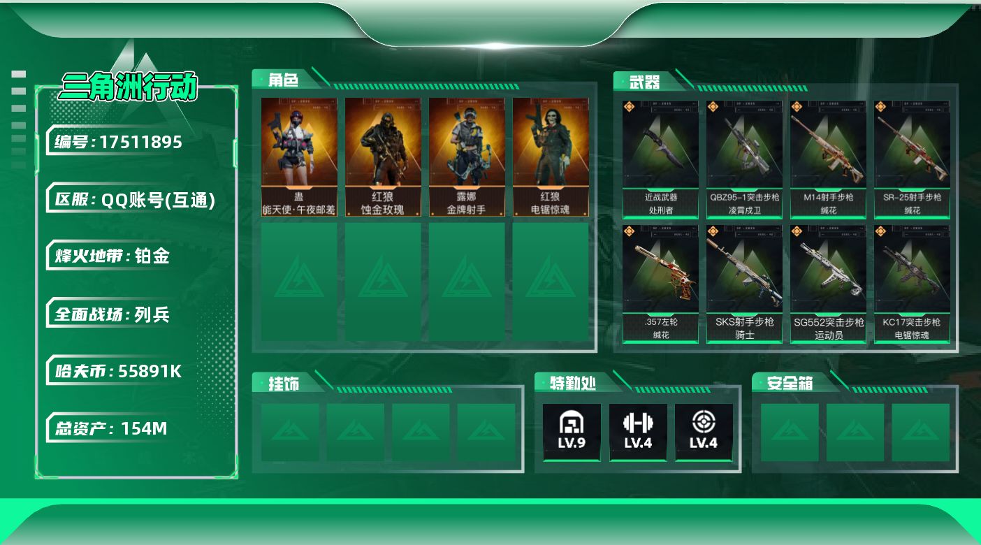 [17511895]154m总资产-55891k哈伏币-60烽火等级-铂金-22战场等级-列兵 【干员外观】:红狼-蚀金玫瑰,蛊-能天使午夜邮差,红狼-电锯惊魂,露娜-金牌射手 【近战皮肤】:近战-处刑者1级,近战-黑鹰 【传说外观】:M4A1突击步枪-蚀金玫瑰,M4A1突击步枪-阿米娅,QBZ95-1突击步枪-凌霄戍卫,ASh-12战斗步枪-鹅鸭杀,SG552突击步枪-运动员,AK-12突击步枪-特斯拉线圈,SCAR-H战斗步枪-启航,SCAR-H战斗步枪-荼蘼,CAR-15突击步枪-阿米娅,AS Val突击步枪-蛇年祥瑞,KC17突击步枪-电锯惊魂,Vector冲锋枪-能天使-午夜邮差,UZI冲锋枪-特斯拉线圈,SR-3M紧凑突击步枪-特斯拉线圈,SR-3M紧凑突击步枪-荼蘼,勇士冲锋枪-能天使-午夜邮差,QCQ171冲锋枪-鹅鸭杀,PKM通用机枪-荼蘼,M250通用机枪-骑士之心,QJB201轻机枪-鹅鸭杀,M14射手步枪-缄花,SKS射手步枪-骑士,SR-25射手步枪-缄花,.357左轮-缄花 【史诗外观】:ASh-12战斗步枪-无极限,K416突击步枪-冬日风情,M7战斗步枪-百步穿杨,SG552突击步枪-哈夫克警备,G3战斗步枪-流沙送葬,AS Val突击步枪-百步穿杨,K437突击步枪-守护者,MP5冲锋枪-战术竞备,MP5冲锋枪-竞技风,P90冲锋枪-紧急戒备,Vector冲锋枪-百步穿杨,SR-3M紧凑突击步枪-战术竞备,MP7冲锋枪-守护者,MP7冲锋枪-六套之力,M250通用机枪-囚徒,QJB201轻机枪-炽焰,Mini-14射手步枪-守护者,M14射手步枪-工业狂潮,SV-98狙击步枪-林中猎手,M700狙击步枪-百步穿杨,AWM狙击步枪-无极限,AWM狙击步枪-流沙送葬,复合弓-守护者 【稀有外观】:M4A1突击步枪-繁盛,AKM突击步枪-战术演练,AKM突击步枪-肃杀,ASh-12战斗步枪-繁盛,K416突击步枪-一帆风顺,M7战斗步枪-捣蛋鬼,SG552突击步枪-2026,SG552突击步枪-贴花艺术, AK-12突击步枪-马年新春,SCAR-H战斗步枪-黄昏,G3战斗步枪-战术演练,G3战斗步枪-主宰*2,腾龙突击步枪-冰天雪地,MK47突击步枪-冰河潜伏者,MP5冲锋枪-哈夫克卫队,P90冲锋枪-黄昏,P90冲锋枪-捣蛋鬼,UZI冲锋枪-亚特兰蒂斯,