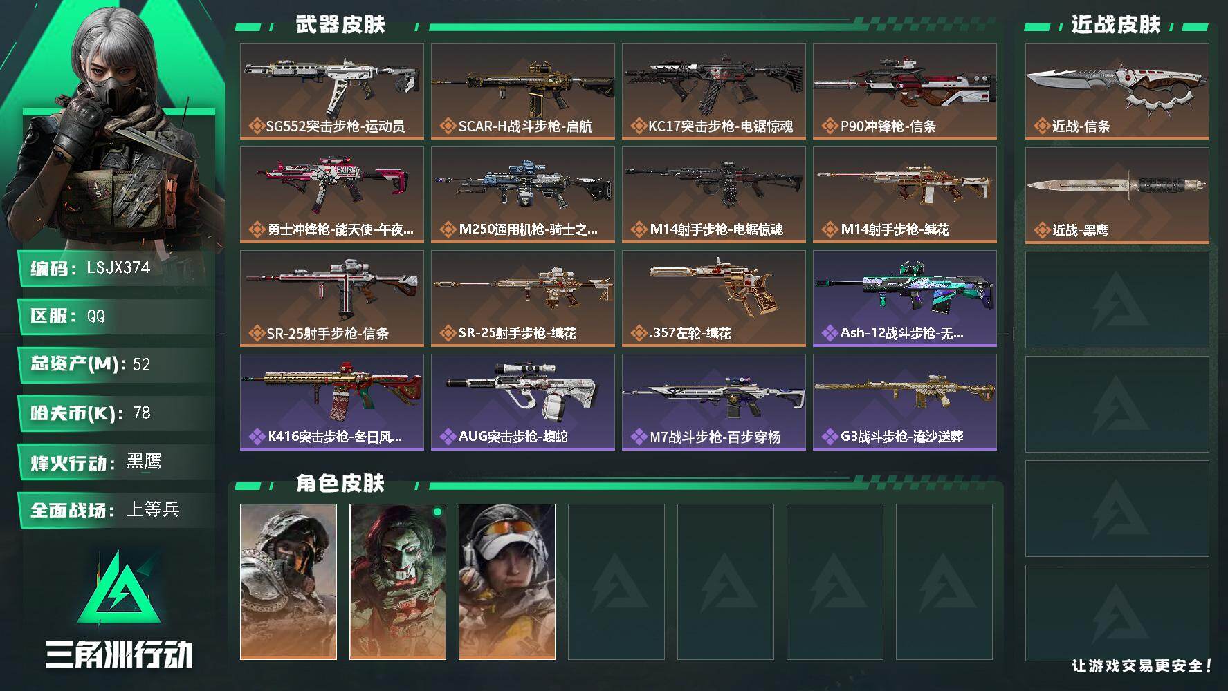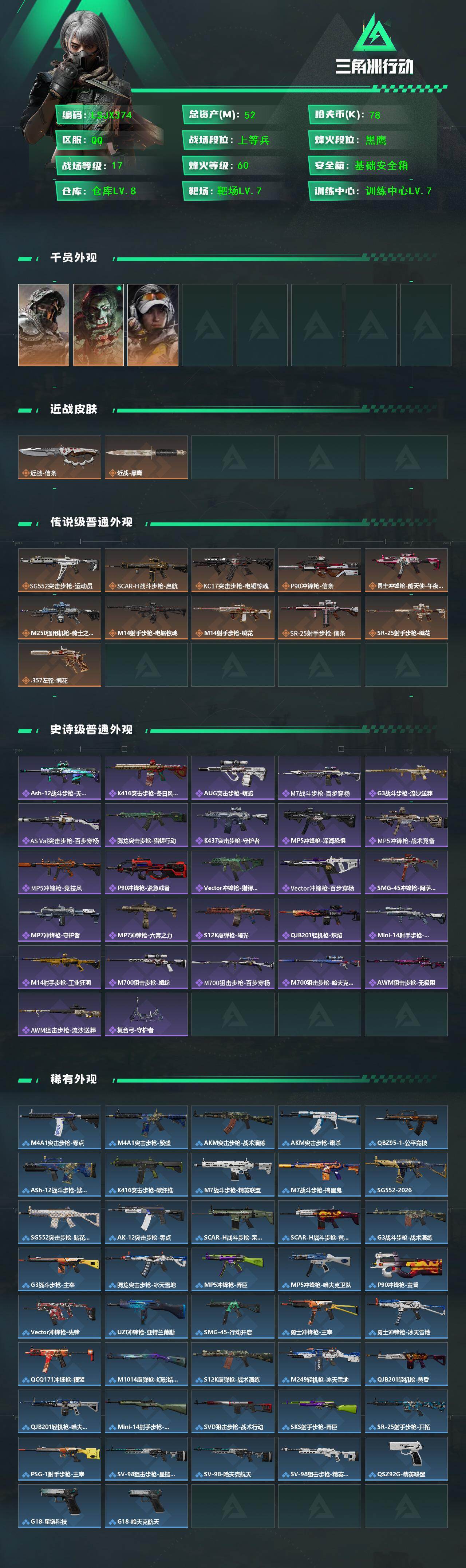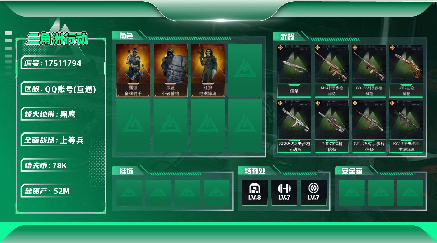 [17511794]【特价出售/店主推荐】 52m总资产-78k哈伏币-60烽火等级-黑鹰-17战场等级-上等兵 【干员外观】:深蓝-不破誓约,红狼-电锯惊魂,露娜-金牌射手 【近战皮肤】:近战-信条,近战-黑鹰 【传说外观】:SG552突击步枪-运动员,SCAR-H战斗步枪-启航,KC17突击步枪-电锯惊魂,P90冲锋枪-信条,勇士冲锋枪-能天使-午夜邮差,M250通用机枪-骑士之心,M14射手步枪-电锯惊魂,M14射手步枪-缄花,SR-25射手步枪-信条,SR-25射手步枪-缄花,.357左轮-缄花 【史诗外观】:ASh-12战斗步枪-无极限,K416突击步枪-冬日风情,AUG突击步枪-蝮蛇,M7战斗步枪-百步穿杨,G3战斗步枪-流沙送葬,AS Val突击步枪-百步穿杨,腾龙突击步枪-猎鳄行动,K437突击步枪-守护者,MP5冲锋枪-深海恐惧,MP5冲锋枪-战术竞备,MP5冲锋枪-竞技风,P90冲锋枪-紧急戒备,Vector冲锋枪-猎鳄行动,Vector冲锋枪-百步穿杨,SMG-45冲锋枪-阿萨拉特攻,MP7冲锋枪-守护者,MP7冲锋枪-六套之力,S12K霰弹枪-曙光,QJB201轻机枪-炽焰,Mini-14射手步枪-守护者,M14射手步枪-工业狂潮,M700狙击步枪-蝮蛇,M700狙击步枪-百步穿杨,M700狙击步枪-哈夫克警备,AWM狙击步枪-无极限,AWM狙击步枪-流沙送葬,复合弓-守护者 【稀有外观】:M4A1突击步枪-零点,M4A1突击步枪-繁盛,AKM突击步枪-战术演练,AKM突击步枪-肃杀,QBZ95-1突击步枪-公平竞技,ASh-12战斗步枪-繁盛,K416突击步枪-碳纤维,M7战斗步枪-精英联盟,M7战斗步枪-捣蛋鬼,SG552突击步枪-2026,SG552突击步枪-贴花艺术,AK-12突击步枪-零点,SCAR-H战斗步枪-荣耀列队,SCAR-H战斗步枪-黄昏,G3战斗步枪-战术演练,G3战斗步枪-主宰*2,腾龙突击步枪-冰天雪地,MP5冲锋枪-弄臣,MP5冲锋枪-哈夫克卫队,P90冲锋枪-黄昏,Vector冲锋枪-先锋,UZI冲锋枪-亚特兰蒂斯,SMG-45冲锋枪-行动开启,勇士冲锋枪-主宰,勇士冲锋枪-冰天雪地,QCQ171冲锋枪-银鹭,M1014霰弹枪-幻影结构,S12K霰弹枪-战术演练,M249轻机枪-冰天雪地,QJB201轻机枪-黄昏,QJB201轻