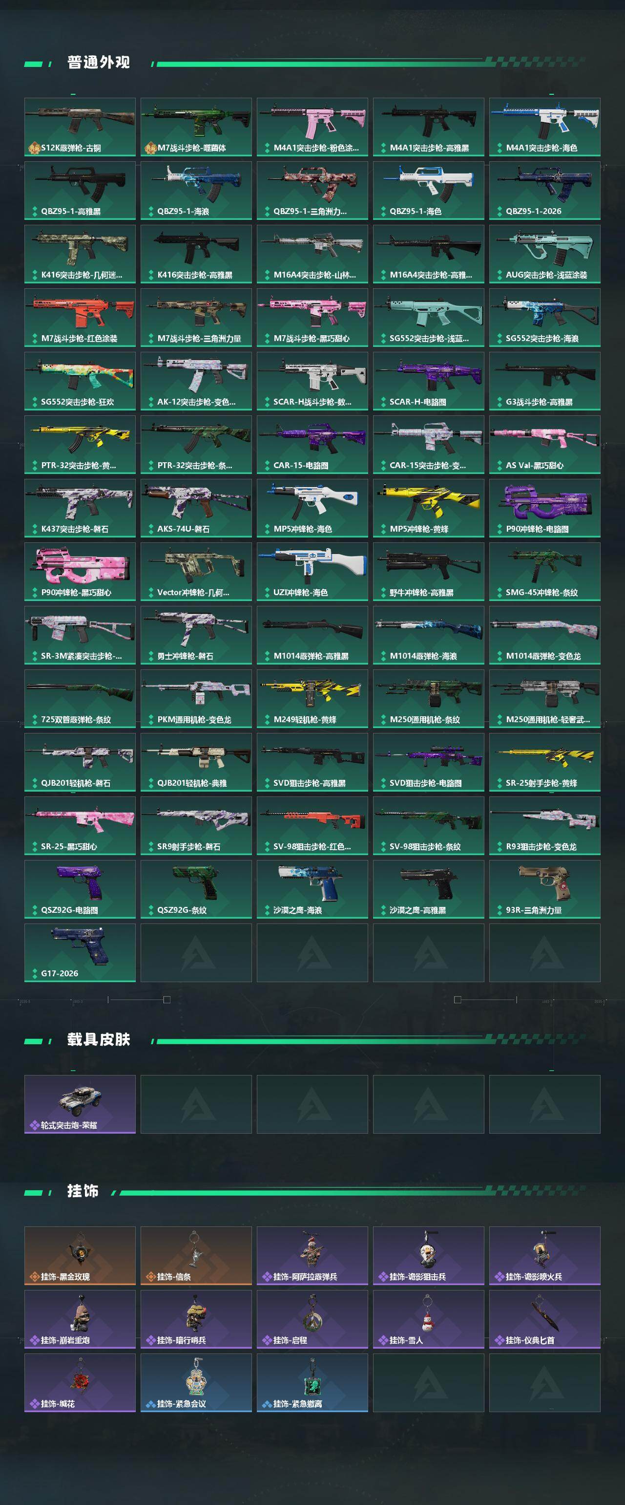 【稀有外观】:M4A1突击步枪-零点,M4A1突击步枪-繁盛,AKM突击步枪-战术演练,AKM突击步枪-肃杀,QBZ95-1突击步枪-公平竞技,ASh-12战斗步枪-繁盛,K416突击步枪-碳纤维,M7战斗步枪-精英联盟,M7战斗步枪-捣蛋鬼,SG552突击步枪-2026,SG552突击步枪-贴花艺术,AK-12突击步枪-零点,SCAR-H战斗步枪-荣耀列队,SCAR-H战斗步枪-黄昏,G3战斗步枪-战术演练,G3战斗步枪-主宰*2,腾龙突击步枪-冰天雪地,MP5冲锋枪-弄臣,MP5冲锋枪-哈夫克卫队,P90冲锋枪-黄昏,Vector冲锋枪-先锋,UZI冲锋枪-亚特兰蒂斯,SMG-45冲锋枪-行动开启,勇士冲锋枪-主宰,勇士冲锋枪-冰天雪地,QCQ171冲锋枪-银鹭,M1014霰弹枪-幻影结构,S12K霰弹枪-战术演练,M249轻机枪-冰天雪地,QJB201轻机枪-黄昏,QJB201轻