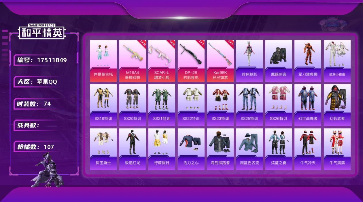 [17511849]可二次【特价出售/店主推荐】苹果 手Q-1粉装-4特效枪-2.9w热力值-5王牌印记-74套装-107枪皮【热门品类】:角色-军刀雅典娜【粉色套装】:粉装-仲夏莫吉托【粉色枪皮等级】:M16A4-垂柳戏鸭(六级),SCAR-L-甜梦小狐(六级),Kar98K-巳巳如意(一级),DP-28-豹影疾电(一级)【粉色枪皮】:M16A4-垂柳戏鸭,SCAR-L-甜梦小狐,Kar98K-巳巳如意,DP-28-豹影疾电