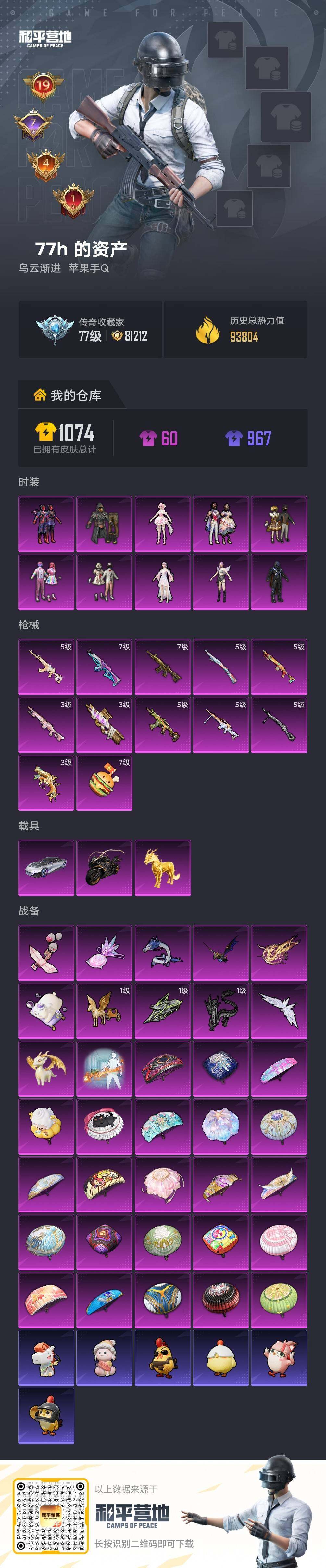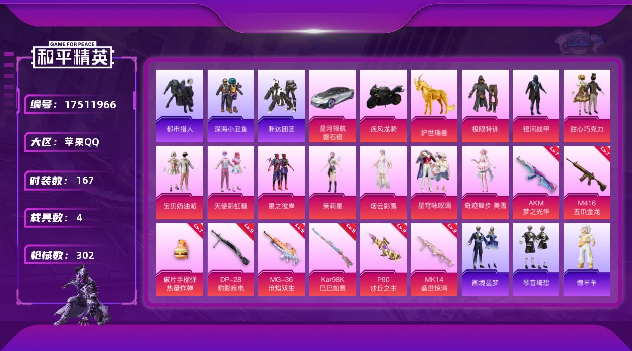 - [12680510]【1124】苹果 手Q-12粉装-1特效枪-5载具-1粉色飞行器-46447热力值-4王牌印记-90套装-101枪皮 【红色载具】:路特斯ELETRE(电光紫)(二级) 【热门品类】:粉装-梦幻火箭,粉装-童趣迷兔,套装-浪漫天命,套装-龟仙人,套装-浪漫波比,套装-粉红小猪 【粉色载具】:特斯拉Roadster(水滴蓝),兰博基尼URUS(明艳黄),路特斯ELETRE(电光紫),焰龙咆哮,双人摩托-梦幻火箭 【粉色套装】:粉装-天使彩虹糖,粉装-梦幻火箭,粉装-天禅智恒,粉装-绚金战神,粉装-童趣迷兔,粉装-烈焰拳霸,粉装-炙焰赤龙,粉装-花影阑珊,粉装-吟月归客,粉装-薄荷物语,粉装-星夜魔法师,粉装-寒光使者 【粉色枪皮等级】:M416-心之恋语(七级) 【粉色枪皮】:M416-心之恋语 【粉色飞行器】:星夜魔法师飞行翼 【粉色降落伞】:至尊龙雀降落伞,梦幻火箭降落伞,四圣焕新降落伞,童趣迷兔降落伞,王牌四分卫降落伞,恐龙拽拽降落伞,星夜魔法师降落伞,圣光天使降落伞,环太平洋降落伞,暖熊萌萌降落伞 【稀有套装】:套装-龟仙人 【稀有枪皮】:AKM-冰凉西瓜,AKM-彩虹符号,AKM-灼热熔岩,AKM-萌趣颜团子,AKM-虎虎生威,M16A4-甜心亚梦,M16A4-红色方程式,SCAR-L-玉兔迎春,SCAR-L-王牌四分卫,M416-梨园星光,GROZA-异彩先驱,GROZA-彩虹符号,GROZA-治愈之星,AUG-青春冒险家,QBZ-彩虹符号,QBZ-飞驰魅影,M762-瑞龙福将,M762-甜心宝贝,M762-绯红前夜,Mk47-粉色回忆,Mk47-青春冒险家,G36C-时空追击者,G36C-暗夜玫瑰,AC-VAL-天降萌叽,AC-VAL-甜心亚梦,蜜獾-娇憨猪猪,UZI-娇憨猪猪,UZI-炫彩节奏,UZI-红色方程式,UMP45-时空追击者,UMP45-生命誓言,Vector-治愈之星,汤姆逊-异彩先驱,汤姆逊-炫彩节奏,汤姆逊-环太平洋,汤姆逊-耀粉歌者,野牛-夜灯,野牛-王牌四分卫,野牛-青春冒险家,MP5K-异彩先驱,P90-飞驰魅影,Kar98K-梦幻火箭,Kar98K-欢乐麻酱,Kar98K-炫彩节奏,Kar98K-飞驰魅影,M24-治愈之星,M24-炫彩节奏,AWM-王牌四分卫,SKS-时空追击者,SKS-迅猛狂鲨,Mini14-异彩先驱,M