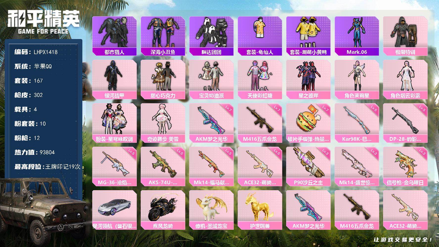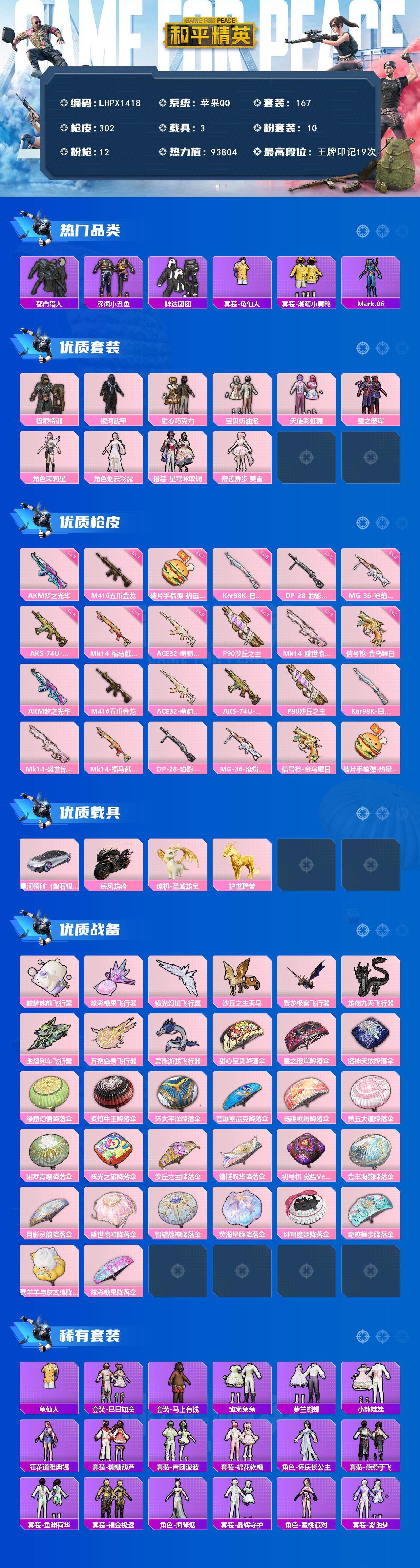 [17511966]可二次【特价出售/店主推荐】/绝世印记1 苹果 手Q-10粉装-12特效枪-4载具-10粉色飞行器-9.3w热力值-19王牌印记-167套装-302枪皮【热门品类】:套装-都市猎人,套装-深海小丑鱼,套装-胖达团团,套装-龟仙人,套装-潮萌小黄鸭,角色-Mark.06【粉色套装】:粉装-极限特训,粉装-银河战甲,粉装-甜心巧克力,粉装-宝贝奶油派,粉装-天使彩虹糖,粉装-星之彼岸,角色-茉莉星,角色-烟云彩露,粉装-星穹咏叹调,角色-奇迹舞步 美雪【粉色枪皮等级】:AKM-梦之光华(七级),M416-五爪金龙(七级),ACE32-萌骑漫游(五级),AKS-74U-森灵之息(五级),P90-沙丘之主(三级),Kar98K-巳巳如意(五级),Mk14-盛世惊鸿(三级),Mk14-福马献瑞(五级),DP-28-豹影疾电(五级),MG-36-沧焰双生(五级),信号枪-金乌曜日(三级),破片手榴弹-热量炸弹(七级)【粉色载具】:星河领航(磐石银),疾风龙骑,僚机-圣域龙宝,护世瑞兽【粉色枪皮】:AKM-梦之光华,M416-五爪金龙,ACE32-萌骑漫游,AKS-74U-森灵之息,P90-沙丘之主,Kar98K-巳巳如意,Mk14-盛世惊鸿,Mk14-福马献瑞,DP-28-豹影疾电,MG-36-沧焰双生,信号枪-金乌曜日,破片手榴弹-热量炸弹【粉色飞行器】:酣梦熊熊飞行器,炫彩糖果飞行器,镜光幻境飞行翼,沙丘之主天马,繁龙极客飞行器,龙翔九天飞行器,幽焰列车飞行器,万象金身飞行器,灵珠游龙飞行器