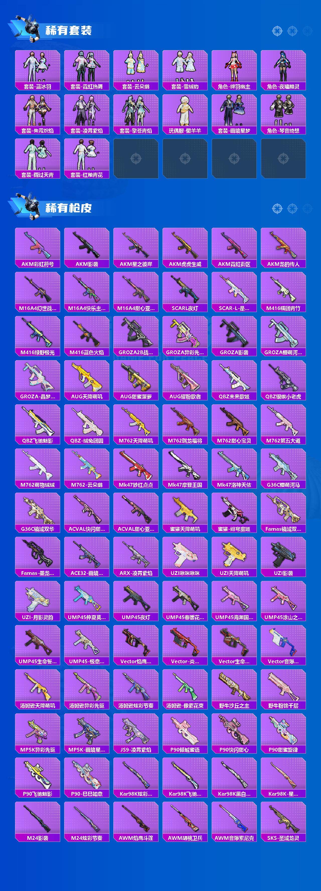 AKM-梦之光华,M416-五爪金龙,P90-沙丘之主,Kar98K-巳巳如意,Mk14-盛世惊鸿,破片手榴弹-热量炸弹