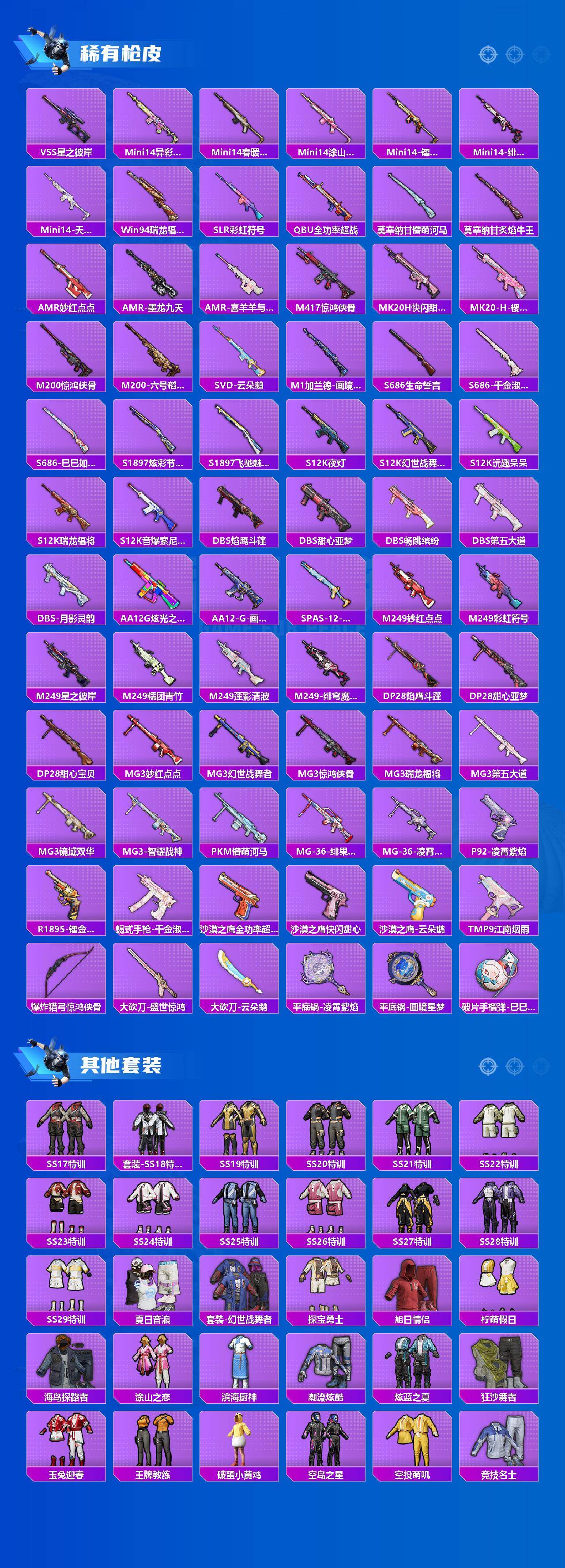 - [15522687]四川一区-134V-15王者-5炫金 【传说武器】:传说暗裔,传说圣谕 【传说角色】:传说星骇 【热门武器】:传说暗裔,传说圣谕,QBZ03-金色蔷薇,Scar Light-白虎,HK417-朱雀,M4A1-青龙,M200-竞技荣光,死亡之眼*3,Kar98K-星神,M4A1-黑骑士,汤姆逊-烈龙*6,RPK-盘龙*6,加特林-炼狱,斯泰尔-蝴蝶,USP-雷暴,COP-堕天神,COP 357-幻灵,沙鹰-修罗*2 【王者炫金武器】:王者之怒,炫金黑龙,炫金武士,炫金天龙,炫金修罗*2 【音效卡】:M4A1-雷神音效卡,M4A1-黑骑士音效卡,Barrett-毁灭音效卡,AWM-裁决音效卡,Barrett-碧霄极光音效卡,炼狱-百战金芒-庆典舞曲音效卡 【皮肤】:白虎-热带奇洋 皮肤,金色蔷薇-热带奇洋 皮肤,星神-璀璨皮肤,星神-漫游,烈龙-星空,雷神-能量核心,雷神-星空,雷神-宠儿-2019MVP,雷神-春花弄影 皮肤,M4A1-再燃火线,火麒麟-平天大圣,火麒麟-百城,毁灭耀金皮肤,毁灭-战神张飞,毁灭-BEAN-2020MVP,毁灭-英雄计划 皮肤,黑龙-能量核心,黑龙-暗月,黑龙-墨子皮肤,黑骑士-地狱火,AK47-黑武士-361,战神-粉色甜心皮肤*2,战神-紫绶金章皮肤,极光-能量核心,修罗-能量核心,屠龙-荣耀之锋,屠龙-星火燎原*3,轻型军用手斧-再燃火线,擎天-秘银 【角色】:魅影,春,凌霄,电竞教官-云悠悠,战地猎狐,王者-瞳-闭月羞花,王者-魅影,奇洋探员,空,风暴女,灵狐者-X,灵狐者-七夕宝贝,龙儿-小淘气,蜀雪,新灵狐者,新娜塔莎,夜玫瑰-宠粉,樱-青春偶像,影武者-X 【人偶武器】:天龙-曼陀罗,火麒麟-灵狐,M4A1-雷神-精英刀锋,斯泰尔-蝴蝶,MAC-10-千针棘鲨,AWM-灵狐-15周年嘉年华,COP-旗袍*2,迷你深渊冰龙,迷你牛牛,迷你生化手雷 【暴走生化】:死亡之眼*3 【挑战大师】:神圣爆裂者III,AK47-冰龙粉碎者,VEPR-12-金魔,激光毁灭者III,试炼破坏者III,KAC-圣炎切割者III,神圣爆裂者-末日III,阐释者III*2 【英雄级武器】:AK47-火麒麟,M4A1-黑龙,M4A1-雷神,M4A1-黑骑士,AK47-雷暴,M4A1-青龙,HK417-朱雀,Scar Light-白虎,M4A1-夜