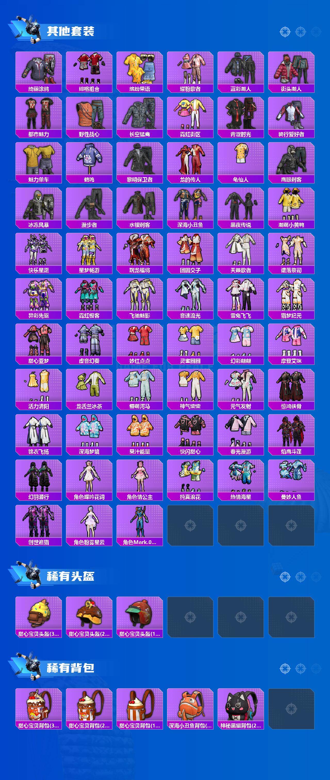 套装-都市猎人,套装-深海小丑鱼,套装-胖达团团,套装-潮萌小黄鸭,套装-极限特训,套装-银河战甲,套装-宝贝奶油派,套装-天使彩虹糖,套装-星之彼岸,角色-茉莉星,角色-烟云彩露,套装-鹰眼刺客