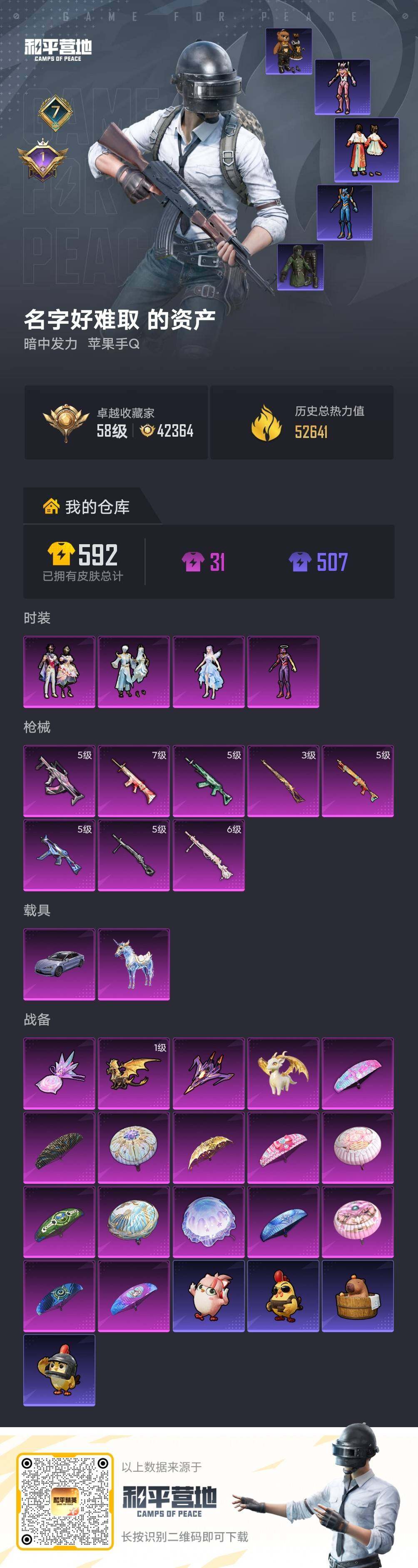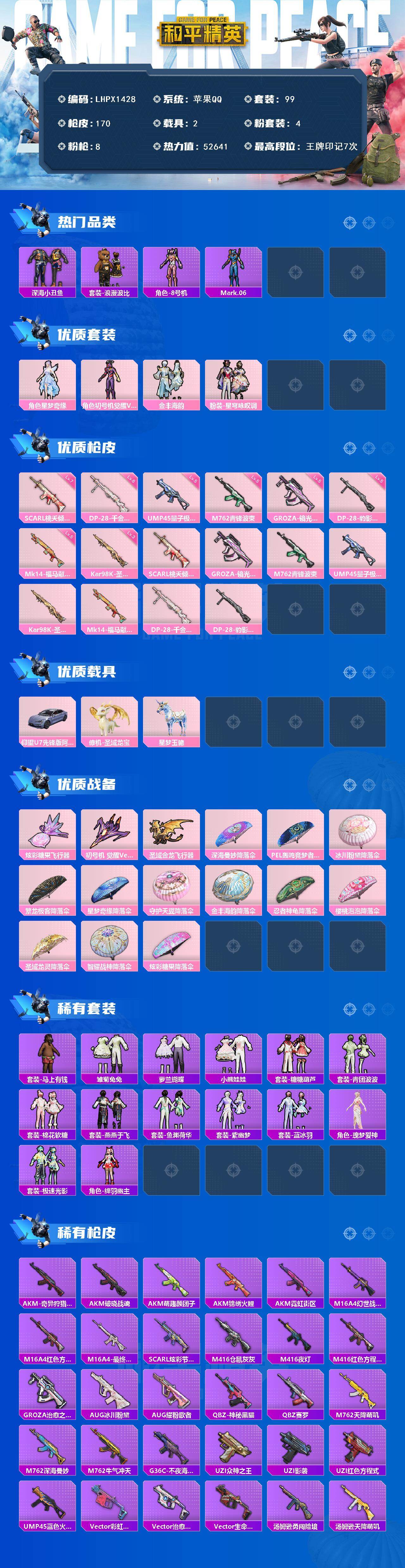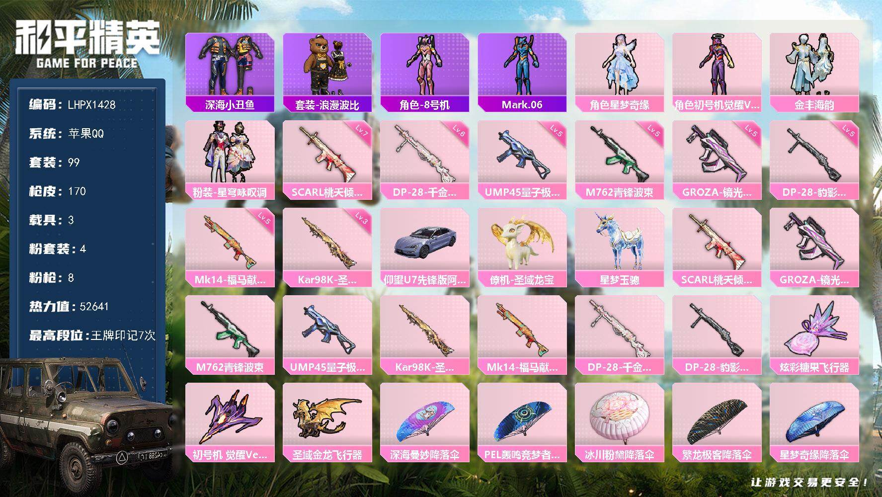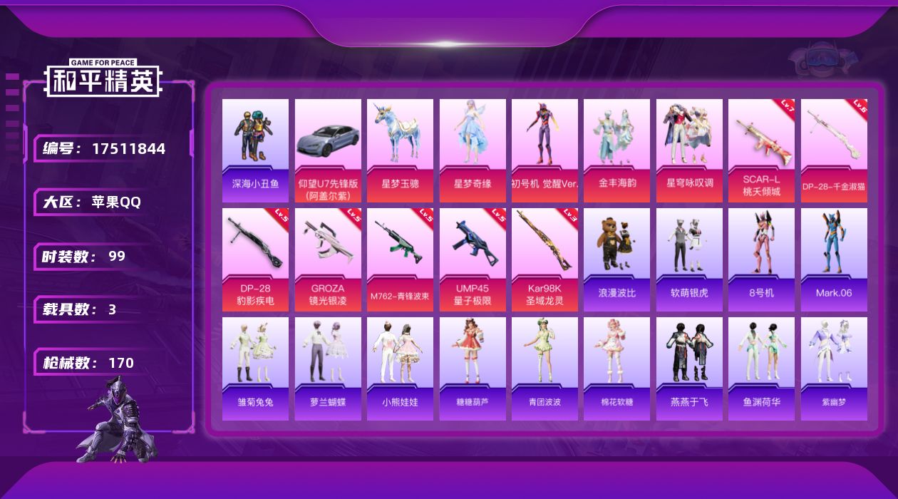 [17511844]【特价出售/店主推荐】 苹果 手Q-4粉装-8特效枪-3载具-3粉色飞行器-5.2w热力值-7王牌印记-99套装-170枪皮【热门品类】:套装-深海小丑鱼,套装-浪漫波比,角色-8号机,角色-Mark.06【粉色套装】:角色-星梦奇缘,角色-初号机 觉醒Ver.,粉装-金丰海韵,粉装-星穹咏叹调【粉色枪皮等级】:SCAR-L-桃夭倾城(七级),GROZA-镜光银凌(五级),M762-青锋波束(五级),UMP45-量子极限(五级),Kar98K-圣域龙灵(三级),Mk14-福马献瑞(五级),DP-28-千金淑猫(六级),DP-28-豹影疾电(五级)【粉色载具】:仰望U7(阿盖尔紫),僚机-圣域龙宝,星梦玉骢【粉色飞行器】:炫彩糖果飞行器,初号机 觉醒Ver.飞行器,圣域金龙飞行器