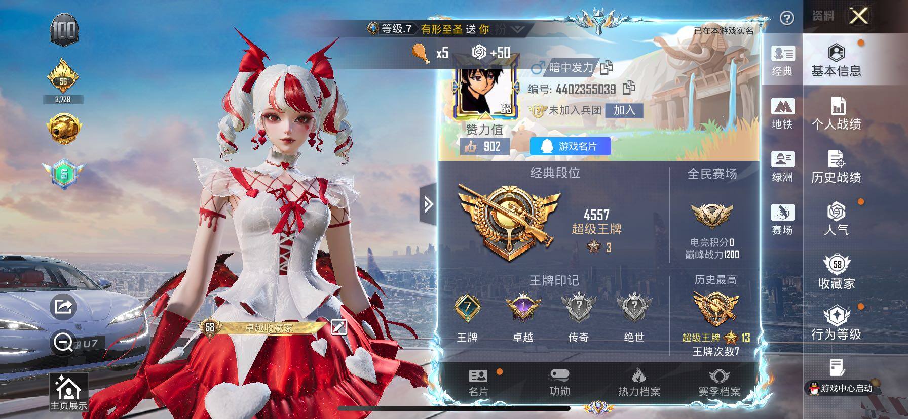 - [12715286]素材身法号/无敌战神框1/地铁满天赋/M416-至情至圣(九级) 安卓 手Q-无敌战神框-2神装-7粉装-17特效枪-2载具-10粉色飞行器-12w热力值-14王牌印记-241套装-362枪皮【红色神装等级】:盛世惊鸿-云鸾(一级),沙丘之主-图卡盟(三级)【热门品类】:粉装-梦幻火箭,套装-浪漫天命,套装-派对舞王,套装-深海小丑鱼,套装-金羽特工,套装-AG战队服,套装-SS1特训,套装-龟仙人,套装-暗影哥特,小恶魔头饰,熔岩游骑兵面罩,熔岩游骑兵连帽夹克【粉色载具】:盛世惊鸿摩托车,护世瑞兽【粉色套装】:粉装-梦幻火箭,粉装-暗夜玫瑰,粉装-蜜语绒猫,角色-千金淑猫,角色-晶梦幻蝶,角色-绯穹魔姬,角色-异瞳寒姬【粉色枪皮等级】:AKM-绿萝繁花(五级),SCAR-L-锦绣绵绵(五级),SCAR-L-金蛇镇世(三级),M416-心之恋语(一级),M416-至情至圣(九级),M416-电玩时刻(五级),GROZA-镜光银凌(五级),AUG-暖羊咩咩(五级),Vector-飒粉甜心(七级),P90-沙丘之主(三级),Kar98K-巳巳如意(五级),M24-镜域双华(三级),Mk14-盛世惊鸿(三级),DP-28-千金淑猫(二级),DP-28-豹影疾电(五级),烟雾弹-丁香清露(四级),破片手榴弹-热量炸弹(六级)【粉色飞行器】:酣梦熊熊飞行器,沙丘之主天马,花傲天飞行器,镜域双华-灵镜之阶,鎏金朋克飞行器,龙翔九天飞行器,凤舞九天飞行器,万象金身飞行器,晶梦幻蝶飞行器