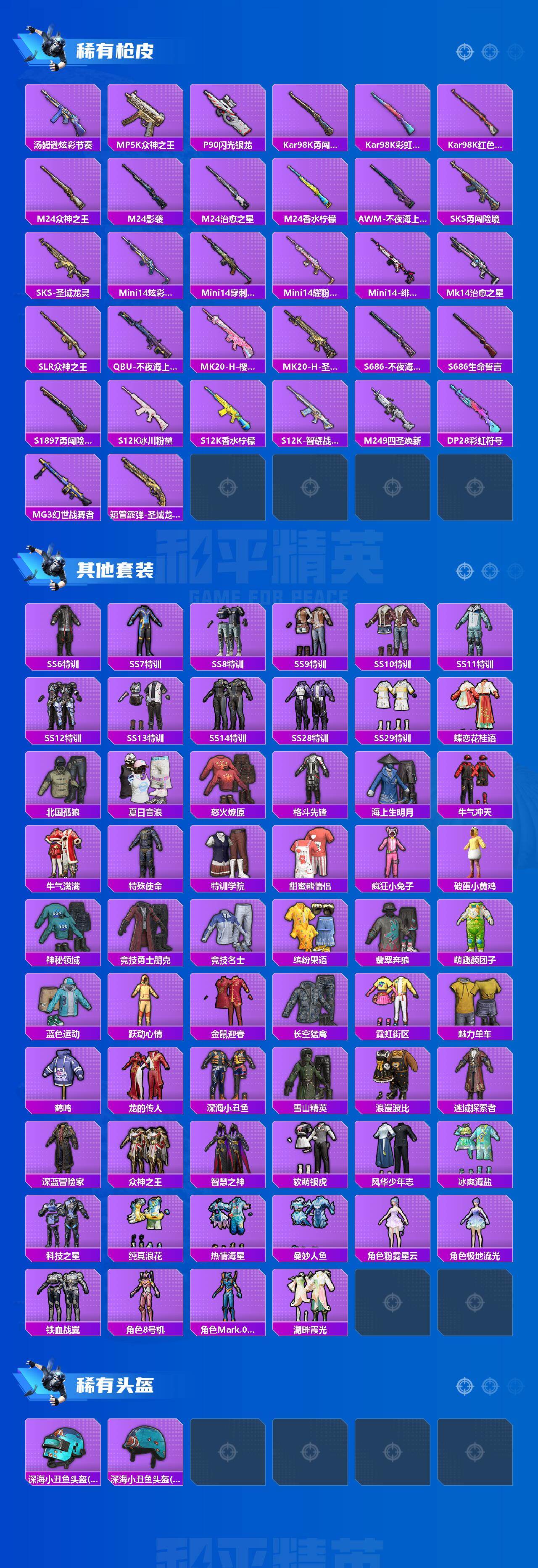 SCAR-L-桃夭倾城,GROZA-镜光银凌,M762-青锋波束,UMP45-量子极限,Kar98K-圣域龙灵,DP-28-千金淑猫
