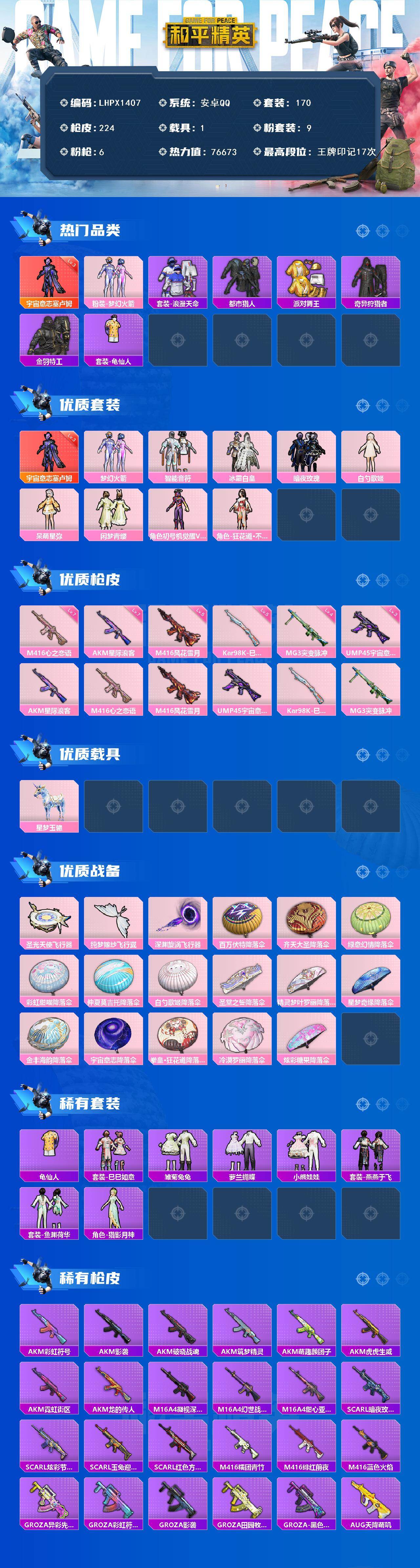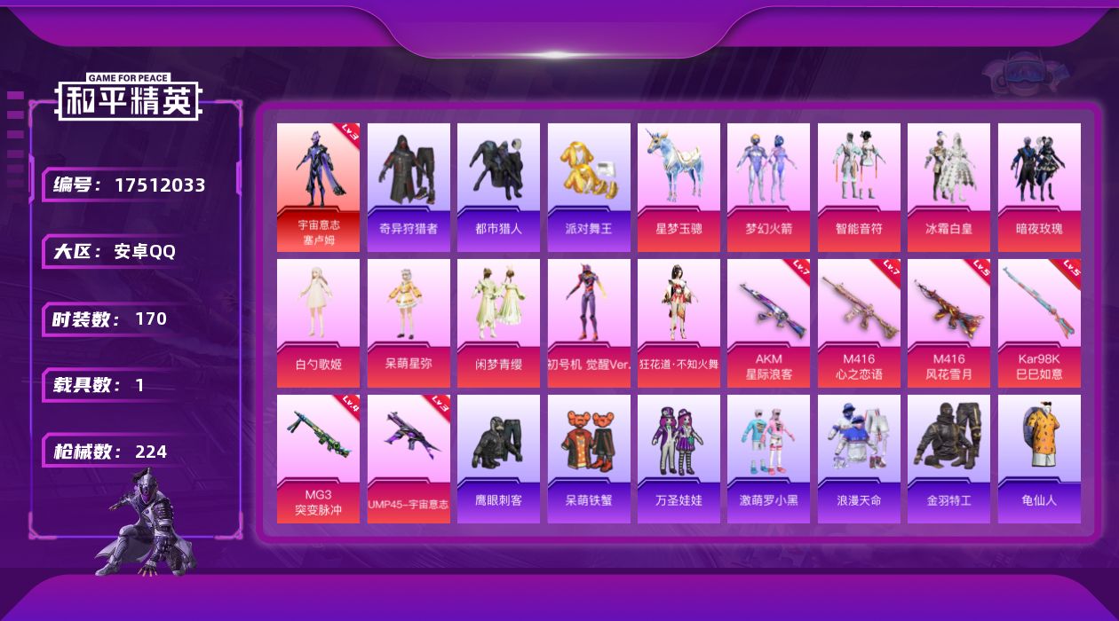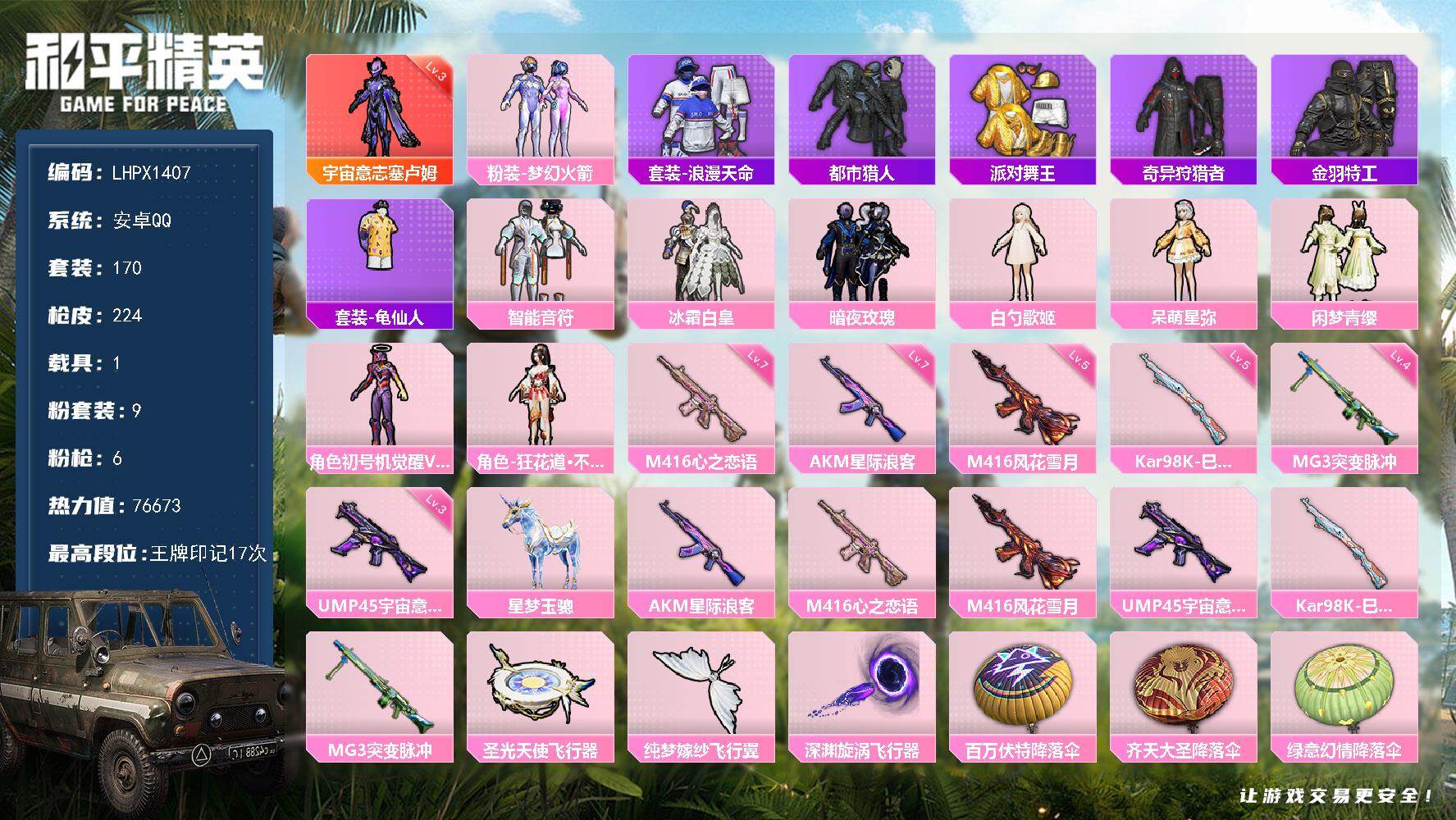 [17512033]【特价出售/店主推荐】 安卓 手Q-1神装-9粉装-6特效枪-1载具-3粉色飞行器-7.6w热力值-17王牌印记-170套装-224枪皮【红色神装等级】:宇宙意志-塞卢姆(三级)【热门品类】:粉装-梦幻火箭,套装-浪漫天命,套装-都市猎人,套装-派对舞王,套装-奇异狩猎者,套装-金羽特工,套装-龟仙人【粉色套装】:粉装-梦幻火箭,粉装-智能音符,粉装-冰霜白皇,粉装-暗夜玫瑰,角色-白勺歌姬,角色-呆萌星弥,粉装-闲梦青缨,角色-初号机 觉醒Ver.,角色-狂花道·不知火舞【粉色枪皮等级】:AKM-星际浪客(七级),M416-心之恋语(七级),M416-风花雪月(五级),UMP45-宇宙意志(三级),Kar98K-巳巳如意(五级),MG3-突变脉冲(四级)【粉色载具】:星梦玉骢【粉色枪皮】:AKM-星际浪客,M416-心之恋语,M416-风花雪月,UMP45-宇宙意志,Kar98K-巳巳如意,MG3-突变脉冲【粉色飞行器】:圣光天使飞行器,纯梦嫁纱飞行翼,深渊漩涡飞行器
