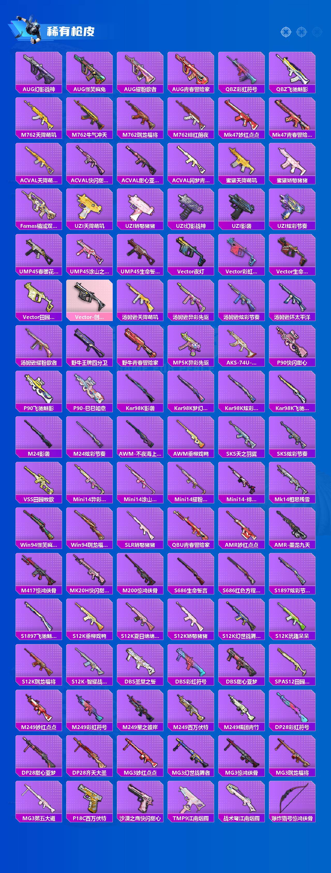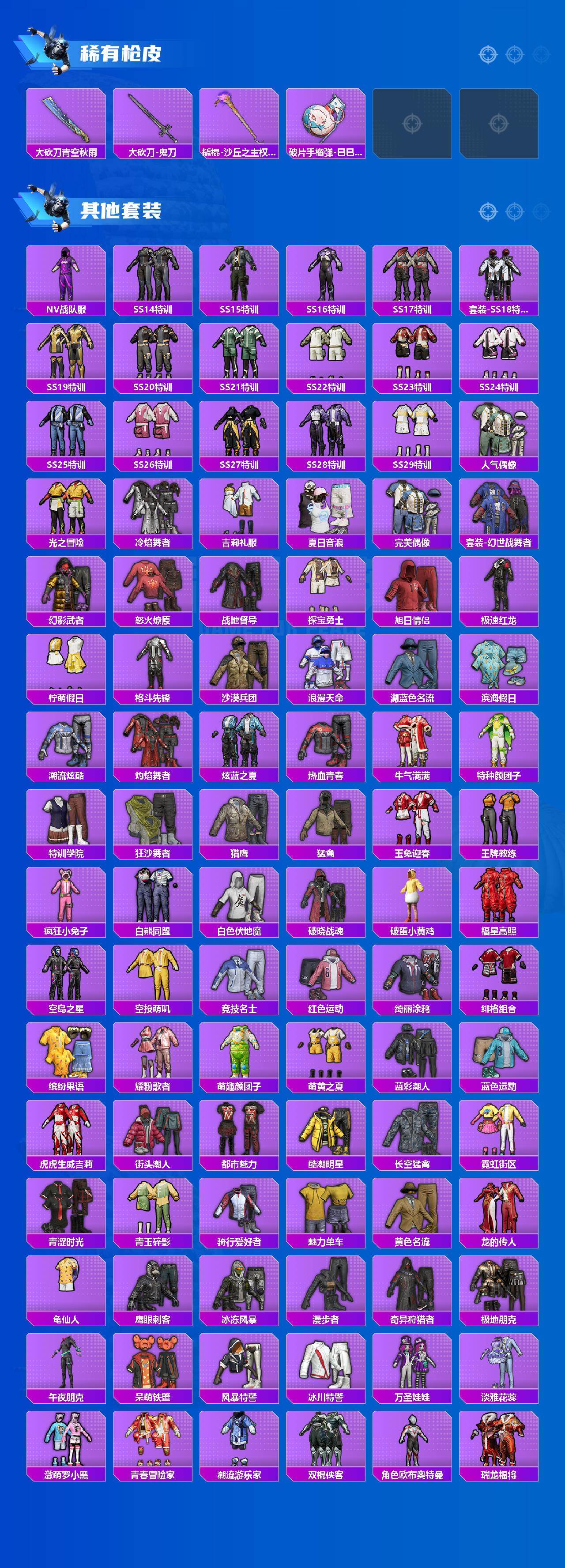 - [15342538]【店主推荐捡漏号!可直接换绑】39388k哈伏币-183m流动资产-60烽火等级-青铜-1战场等级-无军衔 资产212m【干员外观】:红狼-电锯惊魂 【近战皮肤】:近战-黑鹰 【传说外观】:SG552突击步枪-运动员,SCAR-H战斗步枪-启航,KC17突击步枪-电锯惊魂 【史诗外观】:QBZ95-1突击步枪-曙光,G3战斗步枪-流沙送葬,AS Val突击步枪-百步穿杨,Vector冲锋枪-百步穿杨,Vector冲锋枪-异域战争,M250通用机枪-囚徒,SV-98狙击步枪-囚徒,M700狙击步枪-百步穿杨,AWM狙击步枪-流沙送葬 【稀有外观】:AUG突击步枪-旧梦,M4A1突击步枪-繁盛,ASh-12战斗步枪-繁盛,M7战斗步枪-捣蛋鬼,腾龙突击步枪-冰天雪地,MP5冲锋枪-弄臣,MP5冲锋枪-哈夫克卫队,Vector冲锋枪-先锋,UZI冲锋枪-亚特兰蒂斯,SMG-45-行动开启,SMG-45冲锋枪-幻影结构,勇士冲锋枪-主宰,MP7冲锋枪-前沿科技,MP7冲锋枪-钢铁之躯,QJB201轻机枪-哈夫克卫队,Mini-14射手步枪-荣耀列队,SKS射手步枪-弄臣,PSG-1射手步枪-主宰,SV-98狙击步枪-星链科技,SV-98狙击步枪-哈夫克航天,SV-98狙击步枪-精英联盟 【普通外观】:腾龙突击步枪-古铜*2,PTR-32突击步枪-噬菌体,M4A1突击步枪-隐秘行动,M4A1突击步枪-海色,QBZ95-1突击步枪-海浪,QBZ95-1突击步枪-海色,M16A4突击步枪-高雅黑,M7战斗步枪-红色涂装,SG552突击步枪-浅蓝涂装,AK-12突击步枪-变色龙,SCAR-H战斗步枪-红色涂装,SCAR-H战斗步枪-数码迷彩,G3战斗步枪-高雅黑,PTR-32突击步枪-黄蜂,CAR-15突击步枪-变色龙,AS Val突击步枪-隐秘行动,K437突击步枪-磐石,野牛冲锋枪-高雅黑,SR-3M紧凑突击步枪-变色龙,M1014霰弹枪-变色龙,M249轻机枪-黄蜂,M250通用机枪-条纹,QJB201轻机枪-磐石,SVD狙击步枪-高雅黑,SR9射手步枪-磐石,R93狙击步枪-变色龙,沙漠之鹰-高雅黑,93R-三角洲力量 【载具外观】:轮式突击炮-荣耀 【军牌】:军牌-永恒,军牌-零号大坝,军牌-幸福国,军牌-信誉优秀 【挂饰】:挂饰-诡影狙击兵,挂饰-诡影喷火兵,挂饰
