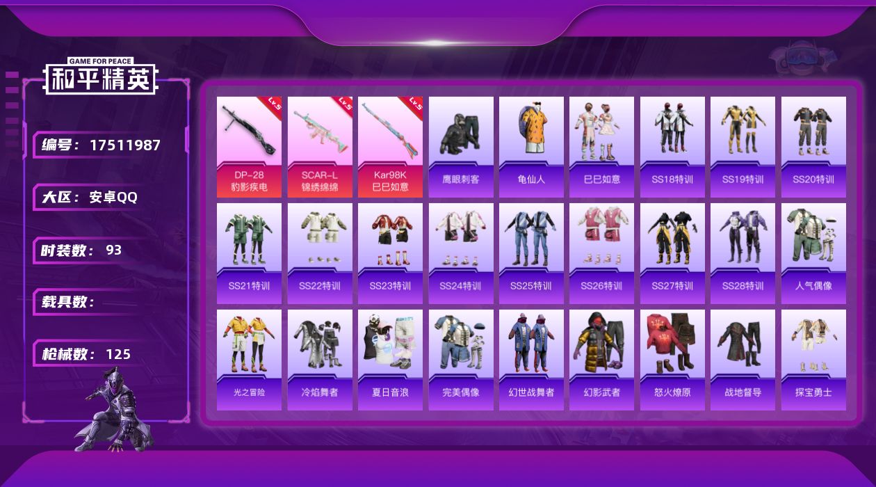 - [16332630]【店主推荐捡漏号!可直接换绑】安卓 手Q-3粉装-3特效枪-3载具-1僚机-2粉色飞行器-24686热力值-1王牌印记-52套装-61枪皮【热门品类】:套装-龟仙人【粉色套装】:粉装-彩虹鹿灵,粉装-黄伞悠悠,粉装-蓝莓炮弹【粉色枪皮等级】:Kar98K-巳巳如意(二级),M249-蓝莓炮弹(四级),DP-28-豹影疾电(四级)【粉色载具】:兰博基尼Aventador SVJ(翡翠绿),兰博基尼Estoque(银翼灰),兰博基尼URUS(明艳黄),空客H135-蔚蓝之翼【粉色枪皮】:Kar98K-巳巳如意,M249-蓝莓炮弹,DP-28-豹影疾电【粉色飞行器】:齐天大圣飞行器