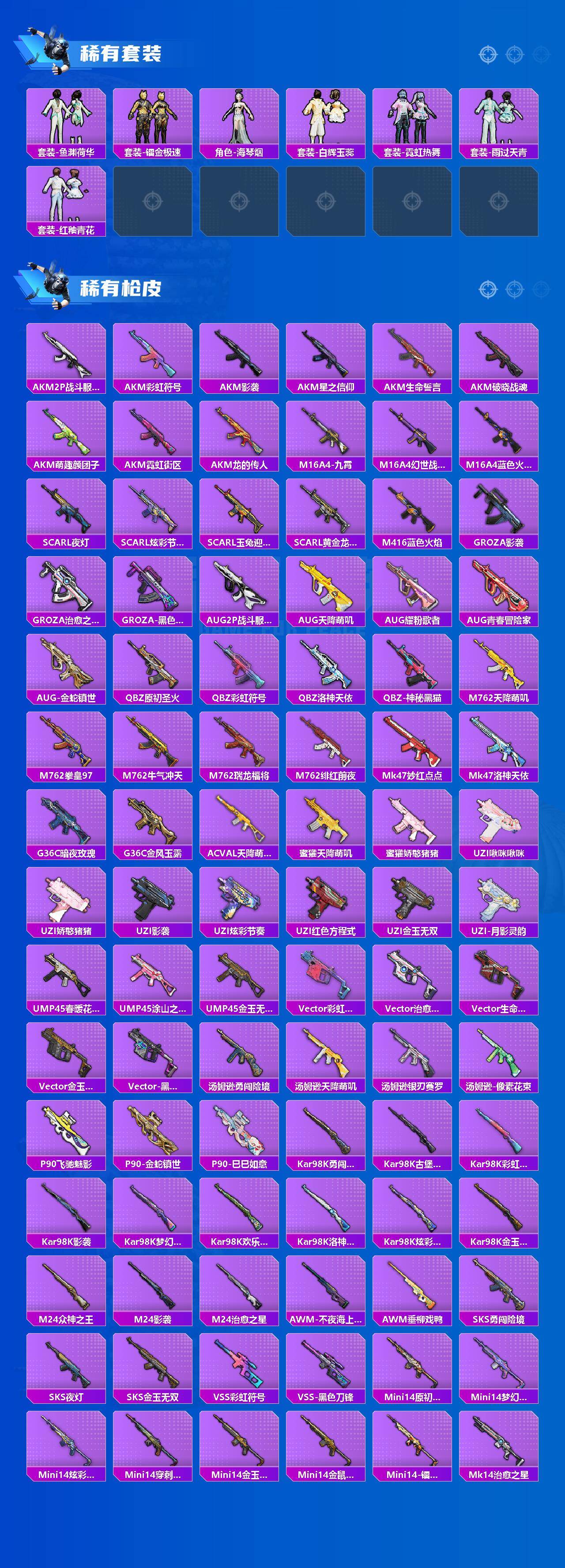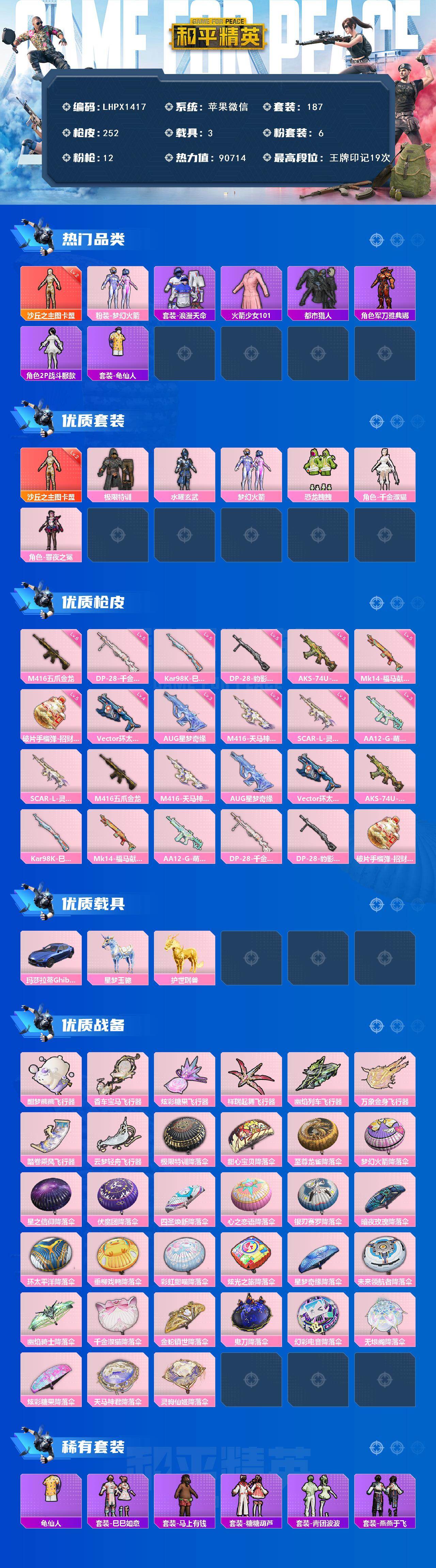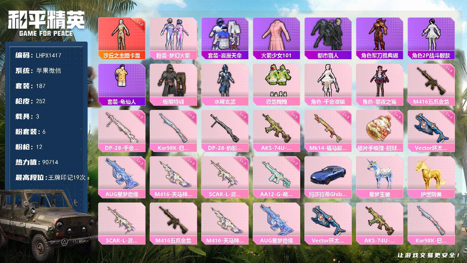 [17511974]【特价出售/店主推荐】 老101 苹果 微信-1神装-6粉装-12特效枪-3载具-11粉色飞行器-9w热力值-19王牌印记-187套装-252枪皮【红色神装等级】:沙丘之主-图卡盟(二级)【热门品类】:粉装-梦幻火箭,套装-浪漫天命,套装-火箭少女101,套装-都市猎人,角色-军刀雅典娜,角色-2P战斗服款,套装-龟仙人【粉色套装】:粉装-极限特训,粉装-水曜玄武,粉装-梦幻火箭,粉装-恐龙拽拽,角色-千金淑猫,角色-罪夜之冕【粉色枪皮等级】:SCAR-L-灵驹仙姬(三级),M416-五爪金龙(六级),M416-天马神君(三级),AUG-星梦奇缘(三级),Vector-环太平洋(四级),AKS-74U-森灵之息(五级),Kar98K-巳巳如意(五级),Mk14-福马献瑞(五级),AA12-G-萌骑幻想(三级),DP-28-千金淑猫(五级),DP-28-豹影疾电(五级),破片手榴弹-招财进宝(五级)【粉色载具】:玛莎拉蒂Ghibli(蓝),星梦玉骢,护世瑞兽【粉色枪皮】:SCAR-L-灵驹仙姬,M416-五爪金龙,M416-天马神君,AUG-星梦奇缘,Vector-环太平洋,AKS-74U-森灵之息,Kar98K-巳巳如意,Mk14-福马献瑞,AA12-G-萌骑幻想,DP-28-千金淑猫,DP-28-豹影疾电,破片手榴弹-招财进宝【粉色飞行器】:酣梦熊熊飞行器,香车宝马飞行器,炫彩糖果飞行器,祥瑞起舞飞行器,幽焰列车飞行器,万象金身飞行器,踏卷乘风飞行器,云梦轻舟飞行器