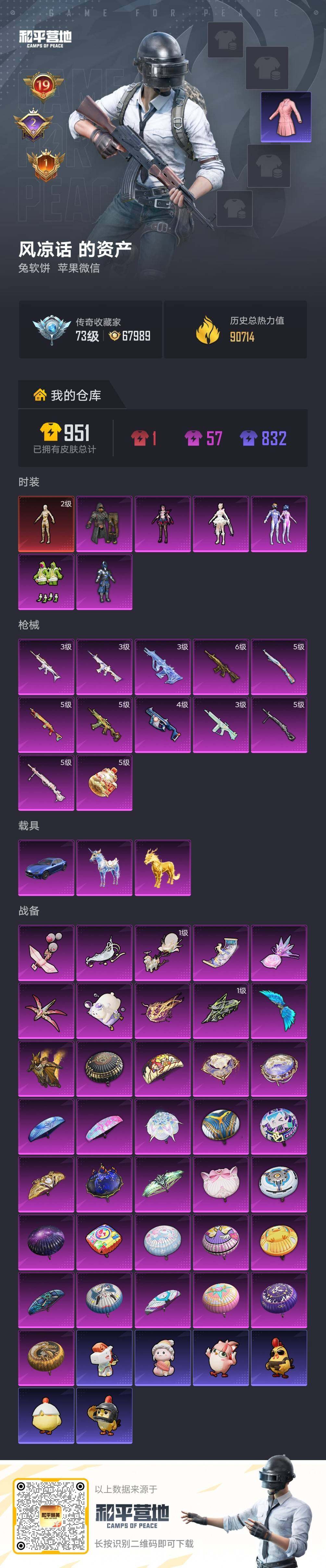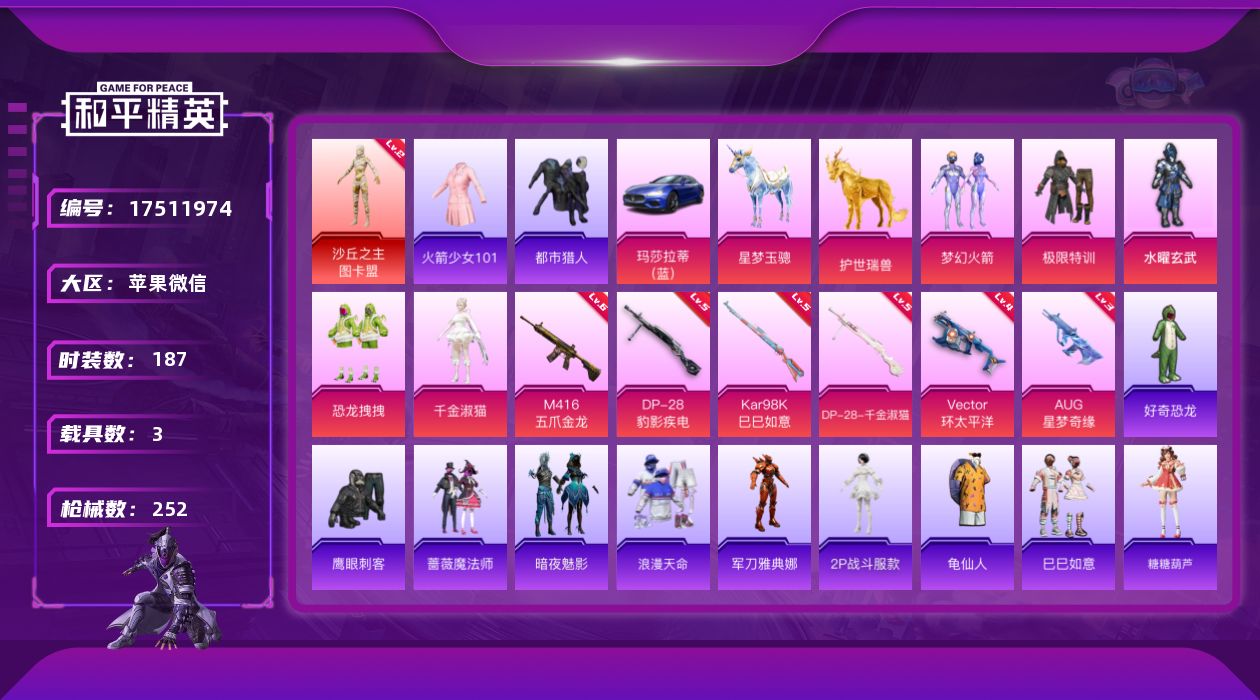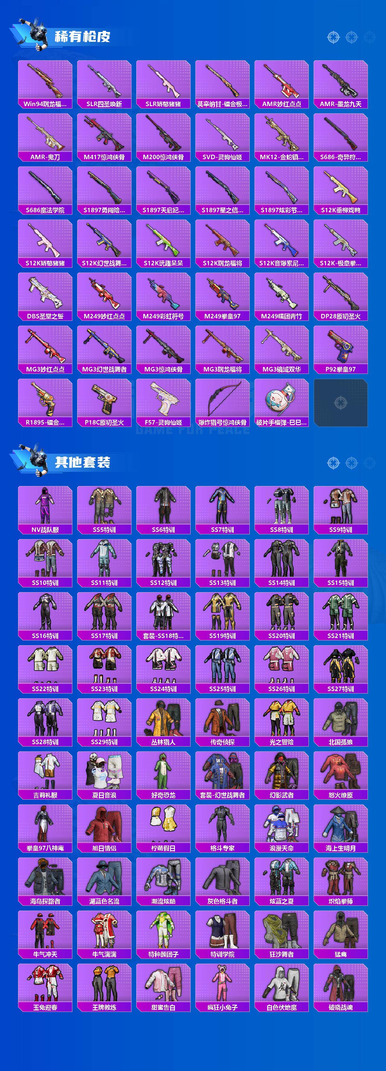 [17511974]【特价出售/店主推荐】 老101 苹果 微信-1神装-6粉装-12特效枪-3载具-11粉色飞行器-9w热力值-19王牌印记-187套装-252枪皮【红色神装等级】:沙丘之主-图卡盟(二级)【热门品类】:粉装-梦幻火箭,套装-浪漫天命,套装-火箭少女101,套装-都市猎人,角色-军刀雅典娜,角色-2P战斗服款,套装-龟仙人【粉色套装】:粉装-极限特训,粉装-水曜玄武,粉装-梦幻火箭,粉装-恐龙拽拽,角色-千金淑猫,角色-罪夜之冕【粉色枪皮等级】:SCAR-L-灵驹仙姬(三级),M416-五爪金龙(六级),M416-天马神君(三级),AUG-星梦奇缘(三级),Vector-环太平洋(四级),AKS-74U-森灵之息(五级),Kar98K-巳巳如意(五级),Mk14-福马献瑞(五级),AA12-G-萌骑幻想(三级),DP-28-千金淑猫(五级),DP-28-豹影疾电(五级),破片手榴弹-招财进宝(五级)【粉色载具】:玛莎拉蒂Ghibli(蓝),星梦玉骢,护世瑞兽【粉色枪皮】:SCAR-L-灵驹仙姬,M416-五爪金龙,M416-天马神君,AUG-星梦奇缘,Vector-环太平洋,AKS-74U-森灵之息,Kar98K-巳巳如意,Mk14-福马献瑞,AA12-G-萌骑幻想,DP-28-千金淑猫,DP-28-豹影疾电,破片手榴弹-招财进宝【粉色飞行器】:酣梦熊熊飞行器,香车宝马飞行器,炫彩糖果飞行器,祥瑞起舞飞行器,幽焰列车飞行器,万象金身飞行器,踏卷乘风飞行器,云梦轻舟飞行器