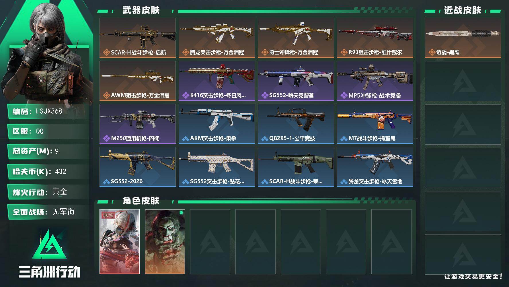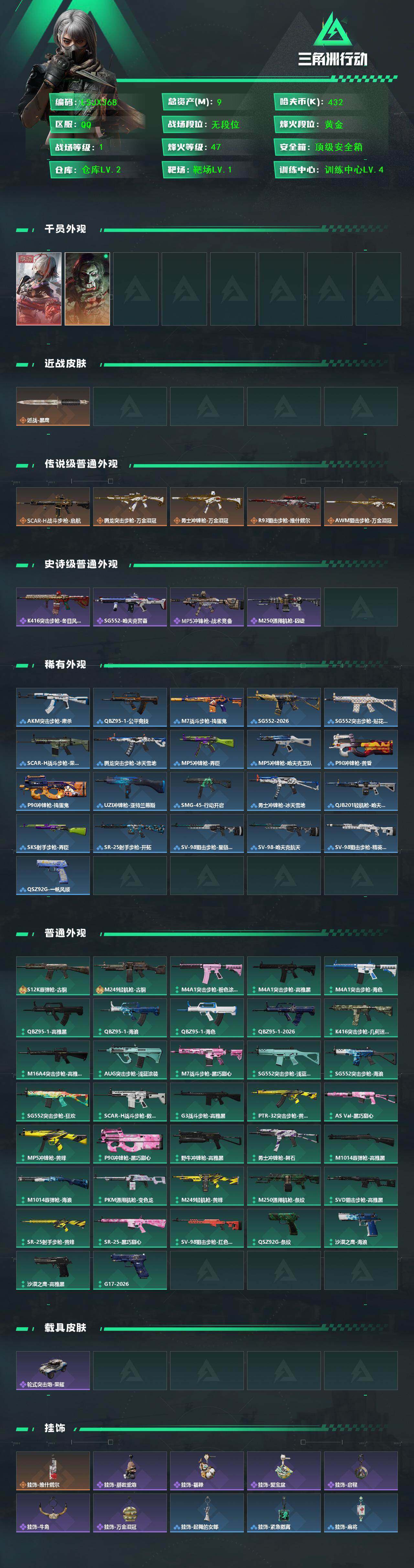 [17511994]【特价出售/店主推荐】9m总资产-432k哈伏币-47烽火等级-黄金-1战场等级-无军衔 【干员外观】:骇爪-维什戴尔,红狼-电锯惊魂 【近战皮肤】:近战-黑鹰 【传说外观】:SCAR-H战斗步枪-启航,腾龙突击步枪-万金泪冠,勇士冲锋枪-万金泪冠,R93狙击步枪-维什戴尔,AWM狙击步枪-万金泪冠 【史诗外观】:K416突击步枪-冬日风情,SG552突击步枪-哈夫克警备,MP5冲锋枪-战术竞备,M250通用机枪-囚徒 【稀有外观】:AKM突击步枪-肃杀,QBZ95-1突击步枪-公平竞技,M7战斗步枪-捣蛋鬼,SG552突击步枪-2026,SG552突击步枪-贴花艺术,SCAR-H战斗步枪-荣耀列队,腾龙突击步枪-冰天雪地,MP5冲锋枪-弄臣,MP5冲锋枪-哈夫克卫队,P90冲锋枪-黄昏,P90冲锋枪-捣蛋鬼,UZI冲锋枪-亚特兰蒂斯,SMG-45冲锋枪-行动开启,勇士冲锋枪-冰天雪地,QJB201轻机枪-哈夫克卫队,SKS射手步枪-弄臣,SR-25射手步枪-开拓,SV-98狙击步枪-星链科技,SV-98狙击步枪-哈夫克航天,SV-98狙击步枪-精英联盟,QSZ92G-一帆风顺 【普通外观】:S12K霰弹枪-古铜,M249轻机枪-古铜,M4A1突击步枪-粉色涂装,M4A1突击步枪-高雅黑,M4A1突击步枪-海色,QBZ95-1突击步枪-高雅黑,QBZ95-1突击步枪-海浪,QBZ95-1突击步枪-海色,QBZ95-1突击步枪-2026,K416突击步枪-几何迷彩,M16A4突击步枪-高雅黑,AUG突击步枪-浅蓝涂装,M7战斗步枪-黑巧甜心,SG552突击步枪-浅蓝涂装,SG552突击步枪-海浪,SG552突击步枪-狂欢,SCAR-H战斗步枪-数码迷彩,G3战斗步枪-高雅黑,PTR-32突击步枪-黄蜂,AS Val突击步枪-黑巧甜心,MP5冲锋枪-黄蜂,P90冲锋枪-黑巧甜心,野牛冲锋枪-高雅黑,勇士冲锋枪-磐石,M1014霰弹枪-高雅黑,M1014霰弹枪-海浪,PKM通用机枪-变色龙,M249轻机枪-黄蜂,M250通用机枪-条纹,SVD狙击步枪-高雅黑,SR-25射手步枪-黄蜂,SR-25射手步枪-黑巧甜心,SV-98狙击步枪-红色涂装,QSZ92G-条纹,沙漠之鹰-海浪,沙漠之鹰-高雅黑,G17-2026 【载具外观】:轮式突击炮-荣耀 【挂饰】:挂饰-维什戴尔