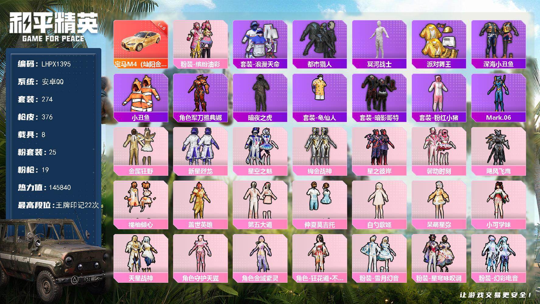 [17512050]宝马M4六级 安卓 手Q-25粉装-19特效枪-8载具-15粉色飞行器-145840热力值-22王牌印记-274套装-376枪皮